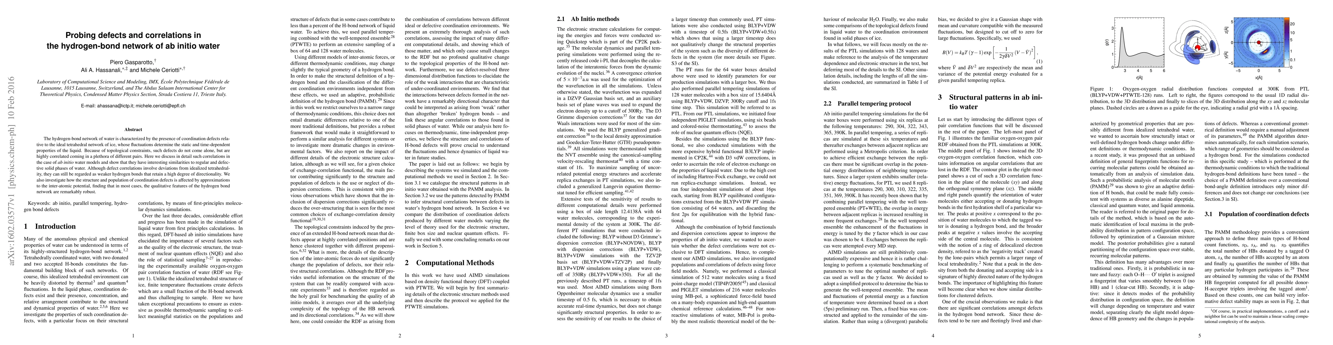 This paper investigates the coordination defects and their correlations in the hydrogen-bond network of ab initio water models, revealing that these defects, while deviating from ideal tetrahedrality, maintain a high degree of directionality as weaker hydrogen bonds. The study also examines the impact of inter-atomic potential approximations on these defects, finding that the network's qualitative features remain robust.