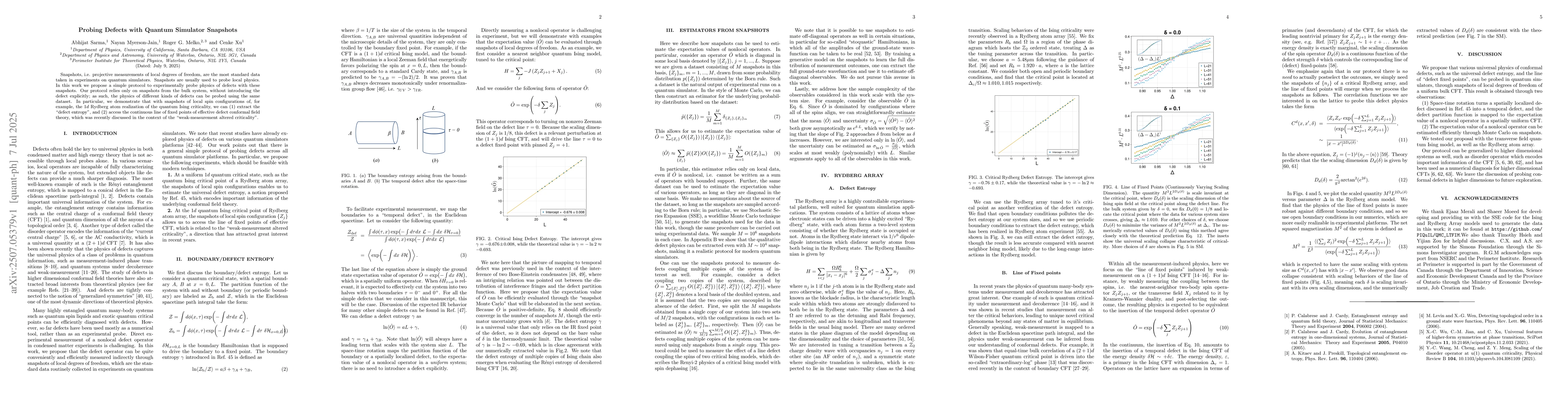 Snapshots, i.e. projective measurements of local degrees of freedom, are the most standard data taken in experiments on quantum simulators. Snapshots are usually used to probe local physics. In this work we propose a simple protocol to experimentally probe physics of defects with these snapshots. Our protocol relies only on snapshots from the bulk system, without introducing the defect explicitly; as such, the physics of different kinds of defects can be probed using the same dataset. In particular, we demonstrate that with snapshots of local spin configurations of, for example, the $1d$ Rydberg atom realization of the quantum Ising criticality, we can (1) extract the ``defect entropy", and (2) access the continuous line of fixed points of effective defect conformal field theory, which was recently discussed in the context of the ``weak-measurement altered criticality".