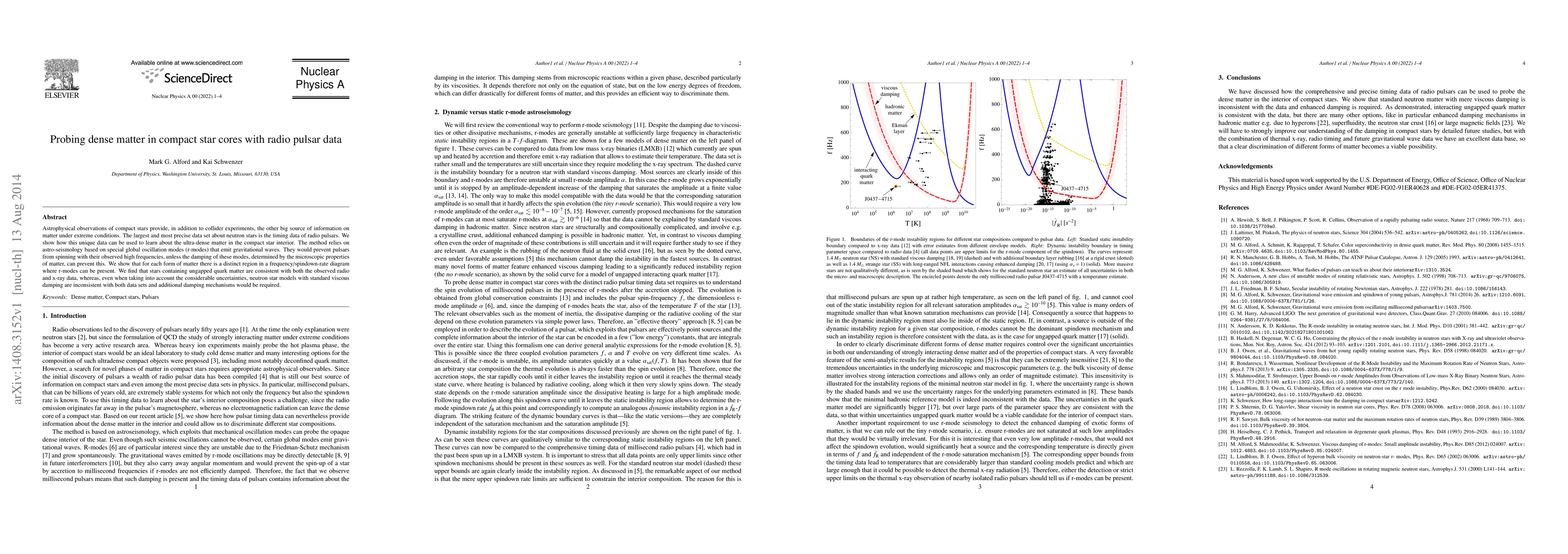 Astrophysical observations of compact stars provide, in addition to collider experiments, the other big source of information on matter under extreme conditions. The largest and most precise data set about neutron stars is the timing data of radio pulsars. We show how this unique data can be used to learn about the ultra-dense matter in the compact star interior. The method relies on astro-seismology based on special global oscillation modes (r-modes) that emit gravitational waves. They would prevent pulsars from spinning with their observed high frequencies, unless the damping of these modes, determined by the microscopic properties of matter, can prevent this. We show that for each form of matter there is a distinct region in a frequency/spindown-rate diagram where r-modes can be present. We find that stars containing ungapped quark matter are consistent with both the observed radio and x-ray data, whereas, even when taking into account the considerable uncertainties, neutron star models with standard viscous damping are inconsistent with both data sets and additional damping mechanisms would be required.