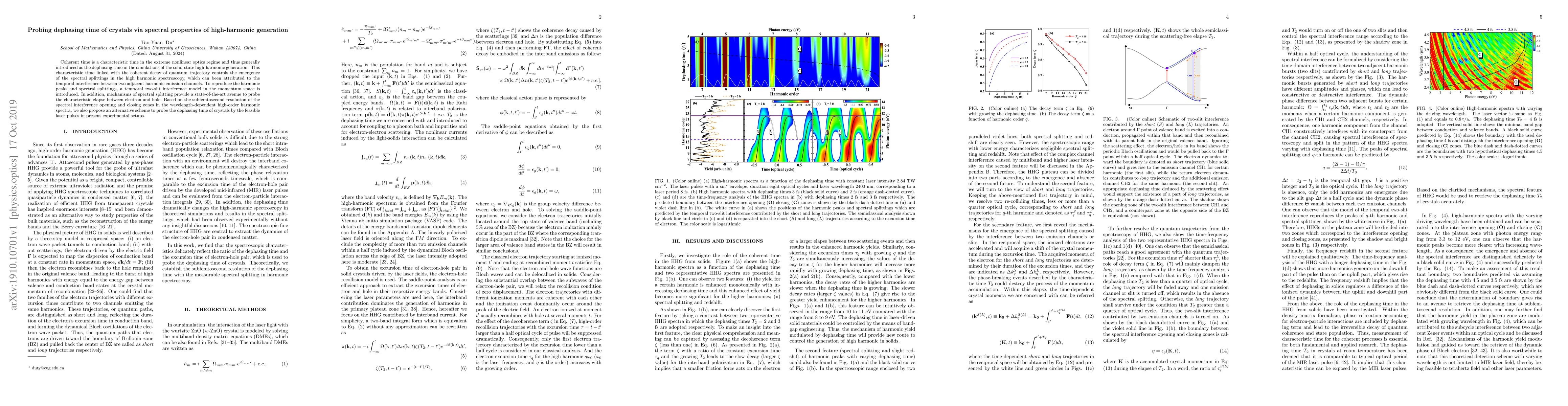 This paper explores the dephasing time in solid-state high-harmonic generation through spectral properties, proposing a temporal two-slit interference model to explain spectral splittings. It suggests a method to probe the characteristic time using the interference patterns in high-order harmonic spectra, offering a new approach for experimental setups.