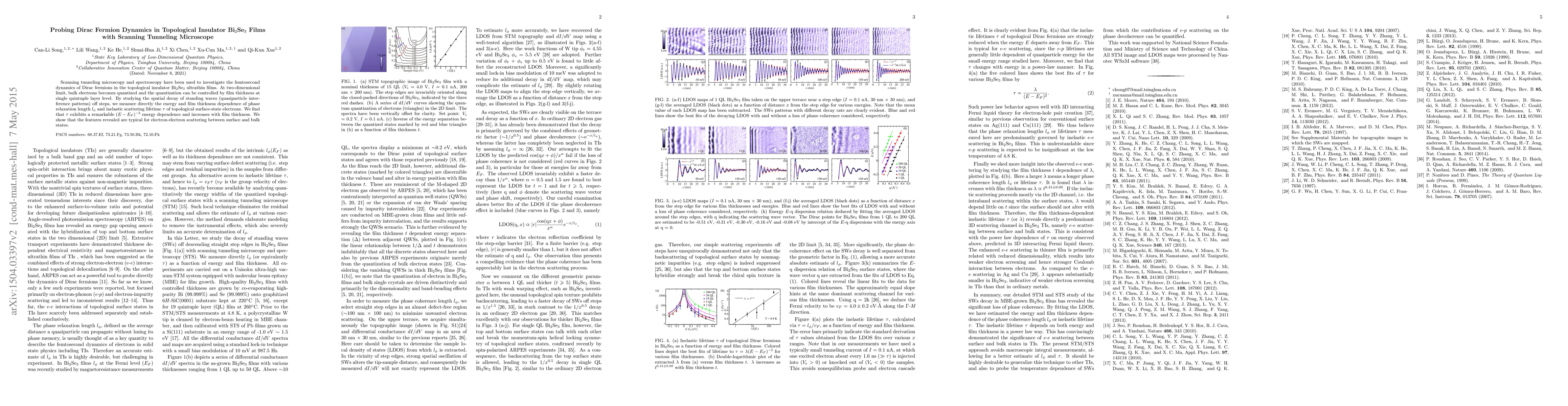 Scanning tunneling microscopy and spectroscopy have been used to investigate the femtosecond dynamics of Dirac fermions in the topological insulator Bi$_2$Se$_3$ ultrathin films. At two-dimensional limit, bulk electrons becomes quantized and the quantization can be controlled by film thickness at single quintuple layer level. By studying the spatial decay of standing waves (quasiparticle interference patterns) off steps, we measure directly the energy and film thickness dependence of phase relaxation length $l_{\phi}$ and inelastic scattering lifetime $\tau$ of topological surface-state electrons. We find that $\tau$ exhibits a remarkable $(E-E_F)^{-2}$ energy dependence and increases with film thickness. We show that the features revealed are typical for electron-electron scattering between surface and bulk states.