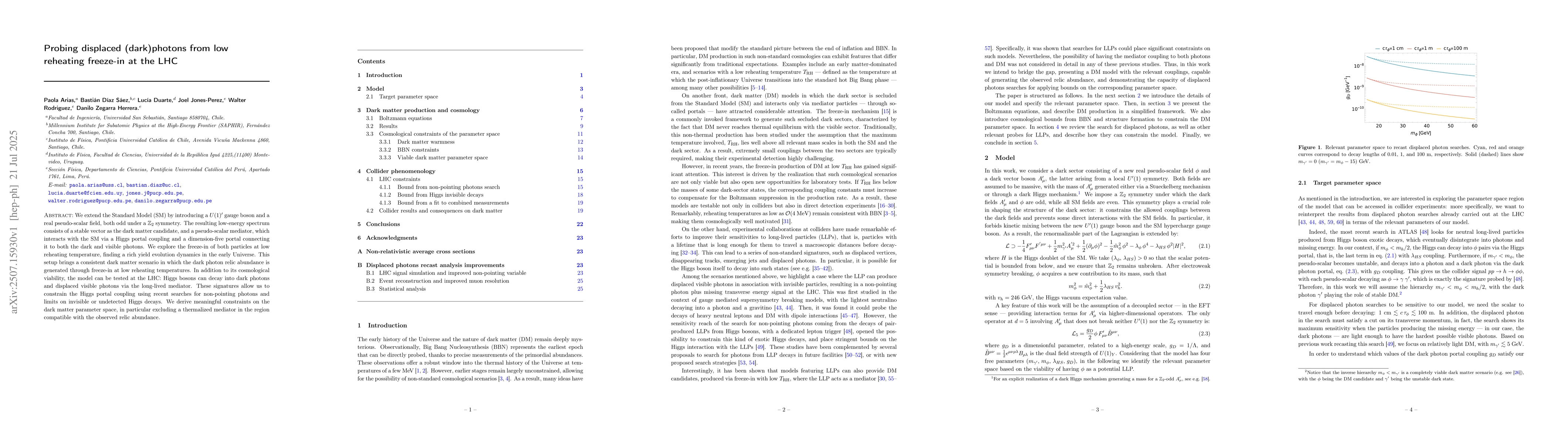 The research extends the Standard Model by introducing a U(1)' gauge boson and a real pseudo-scalar field, both odd under a Z2 symmetry. It explores freeze-in of both particles at low reheating temperatures, testing the model's viability through Higgs boson decays into dark photons and displaced visible photons via a long-lived mediator.