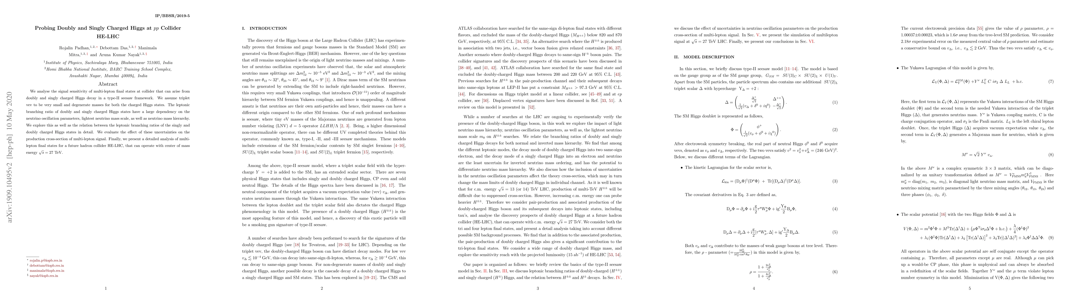 This paper investigates the signal sensitivity of multi-lepton final states at the HE-LHC, focusing on decays from doubly and singly charged Higgs bosons within a type-II seesaw framework. It examines the impact of neutrino oscillation parameters and mass hierarchy on the leptonic branching ratios and production cross-section uncertainties.