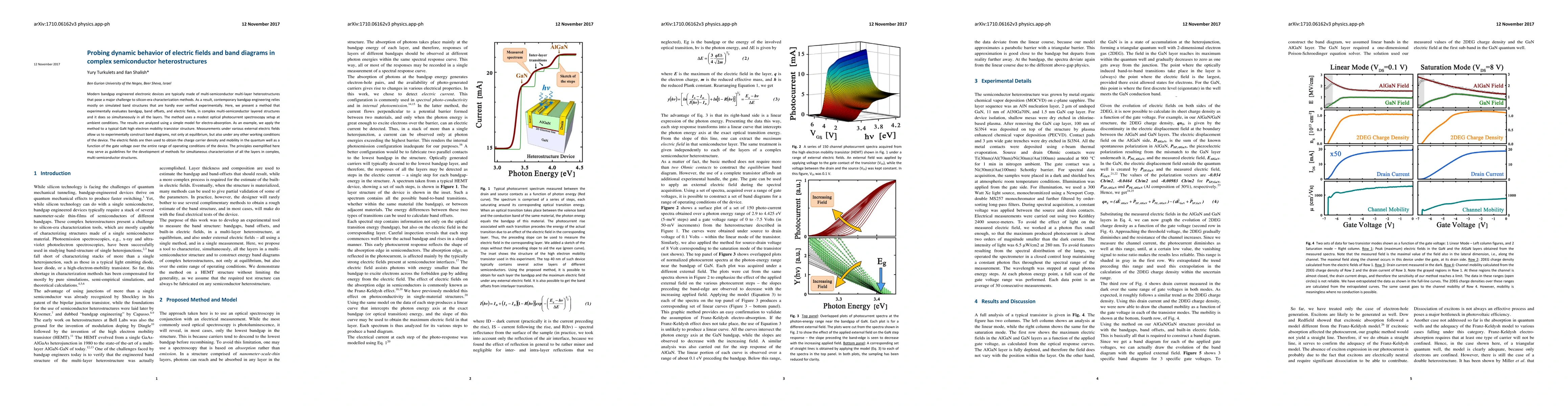 Modern bandgap engineered electronic devices are typically made of multi-semiconductor multi-layer heterostructures that pose a major challenge to silicon-era characterization methods. As a result, contemporary bandgap engineering relies mostly on simulated band structures that are hardly ever verified experimentally. Here, we present a method that experimentally evaluates bandgap, band offsets, and electric fields, in complex multi-semiconductor layered structures and it does so simultaneously in all the layers. The method uses a modest optical photocurrent spectroscopy setup at ambient conditions. The results are analyzed using a simple model for electro-absorption. As an example, we apply the method to a typical GaN high electron mobility transistor structure. Measurements under various external electric fields allow us to experimentally construct band diagrams, not only at equilibrium, but also under any other working conditions of the device. The electric fields are then used to obtain the charge carrier density and mobility in the quantum well as a function of the gate voltage over the entire range of operating conditions of the device. The principles exemplified here may serve as guidelines for the development of methods for simultaneous characterization of all the layers in complex, multi-semiconductor structures.