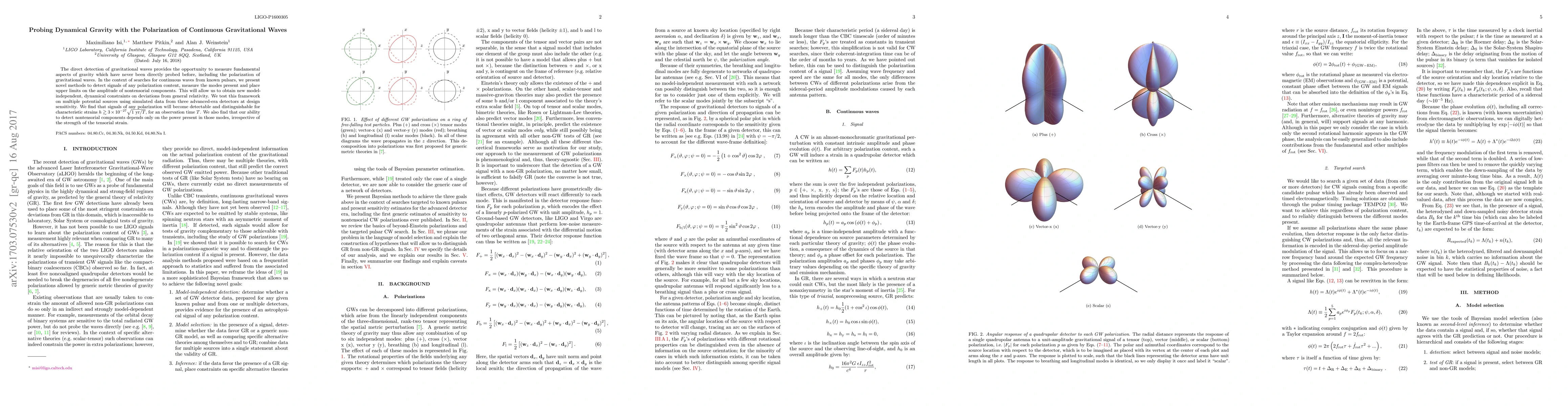 This paper proposes new methods to detect and analyze the polarization of continuous gravitational waves from pulsars, aiming to place constraints on dynamical gravity deviations from general relativity. The study finds that signals of any polarization can be detected for characteristic strains above $h\gtrsim 3\times10^{-27} \sqrt{1~{\rm yr}/T}$, with the detection capability depending on the power in non-tensorial components.