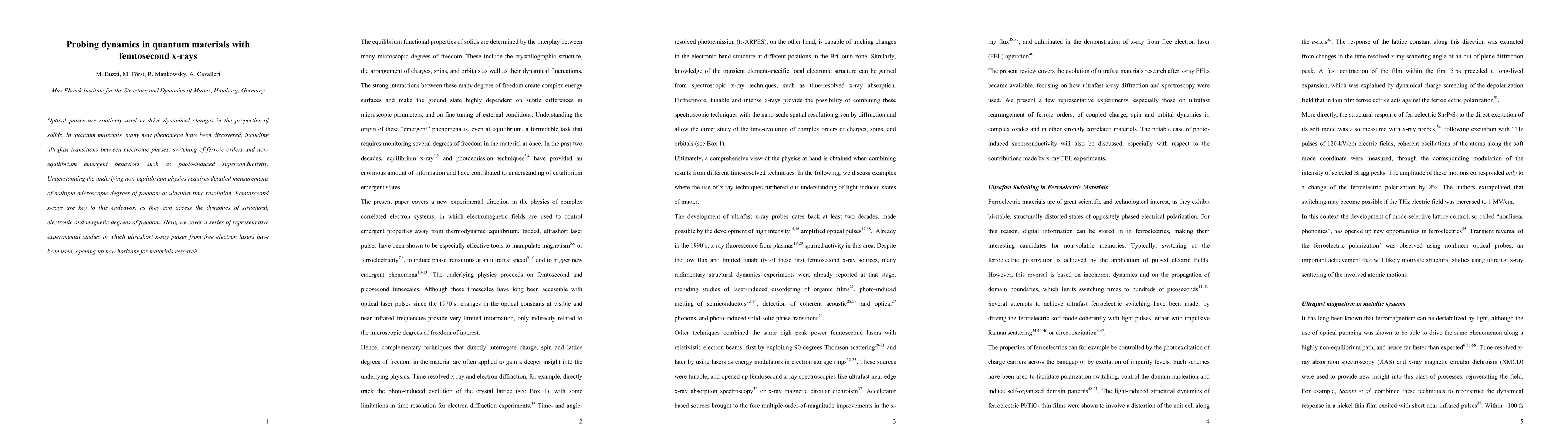 Optical pulses are routinely used to drive dynamical changes in the properties of solids. In quantum materials, many new phenomena have been discovered, including ultrafast transitions between electronic phases, switching of ferroic orders and nonequilibrium emergent behaviors such as photo-induced superconductivity. Understanding the underlying non-equilibrium physics requires detailed measurements of multiple microscopic degrees of freedom at ultrafast time resolution. Femtosecond x-rays are key to this endeavor, as they can access the dynamics of structural, electronic and magnetic degrees of freedom. Here, we cover a series of representative experimental studies in which ultrashort x-ray pulses from free electron lasers have been used, opening up new horizons for materials research.
