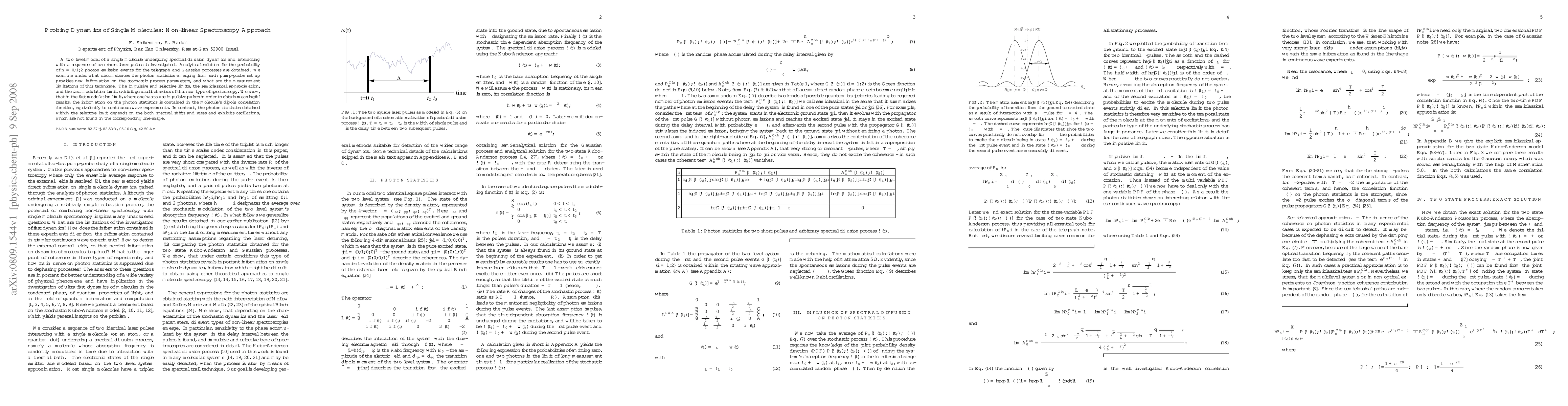 A two level model of a single molecule undergoing spectral diffusion dynamics and interacting with a sequence of two short laser pulses is investigated. Analytical solution for the probability of n=0,1,2 photon emission events for the telegraph and Gaussian processes are obtained. We examine under what circumstances the photon statistics emerging from such pump-probe set up provides new information on the stochastic process parameters, and what are the measurement limitations of this technique. The impulsive and selective limits, the semiclassical approximation, and the fast modulation limit, exhibit general behaviors of this new type of spectroscopy. We show, that in the fast modulation limit, where one has to use impulsive pulses in order to obtain meaningful results, the information on the photon statistics is contained in the molecule's dipole correlation function, equivalently to continuous wave experiments. In contrast, the photon statistics obtained within the selective limit depends on the both spectral shifts and rates and exhibits oscillations, which are not found in the corresponding line-shape.