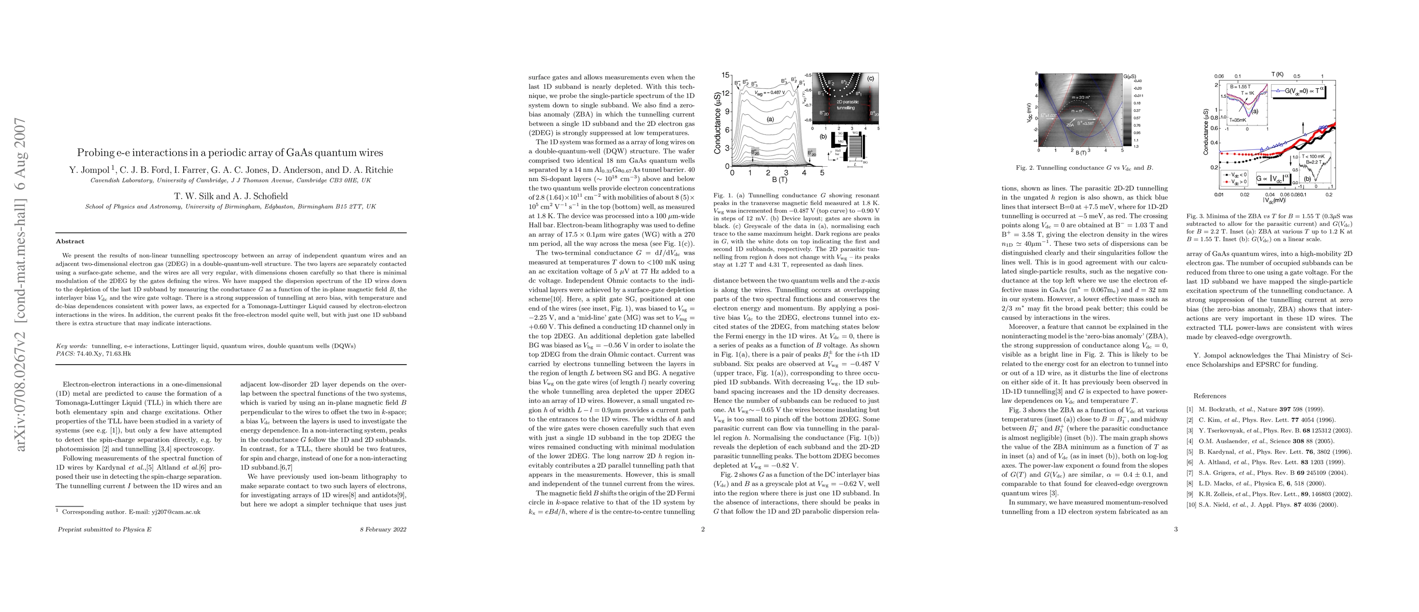 We present the results of non-linear tunnelling spectroscopy between an array of independent quantum wires and an adjacent two-dimensional electron gas (2DEG) in a double-quantum-well structure. The two layers are separately contacted using a surface-gate scheme, and the wires are all very regular, with dimensions chosen carefully so that there is minimal modulation of the 2DEG by the gates defining the wires. We have mapped the dispersion spectrum of the 1D wires down to the depletion of the last 1D subband by measuring the conductance \emph{G} as a function of the in-plane magnetic field \emph{B}, the interlayer bias $V_{\rm dc}$ and the wire gate voltage. There is a strong suppression of tunnelling at zero bias, with temperature and dc-bias dependences consistent with power laws, as expected for a Tomonaga-Luttinger Liquid caused by electron-electron interactions in the wires. In addition, the current peaks fit the free-electron model quite well, but with just one 1D subband there is extra structure that may indicate interactions.