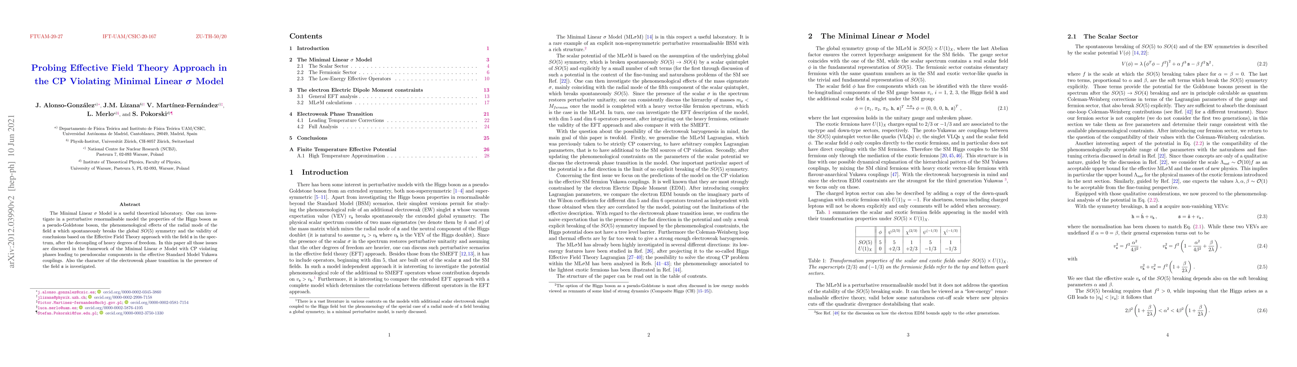 The Minimal Linear $\sigma$ Model is a useful theoretical laboratory. One can investigate in a perturbative renormalisable model the properties of the Higgs boson as a pseudo-Goldstone boson, the phenomenological effects of the radial mode of the field $\mathtt{s}$ which spontaneously breaks the global $SO(5)$ symmetry and the validity of conclusions based on the Effective Field Theory approach with the field $\mathtt{s}$ in the spectrum, after the decoupling of heavy degrees of freedom. In this paper all those issues are discussed in the framework of the Minimal Linear $\sigma$ Model with CP violating phases leading to pseudoscalar components in the effective Standard Model Yukawa couplings. Also the character of the electroweak phase transition in the presence of the field $\mathtt{s}$ is investigated.
