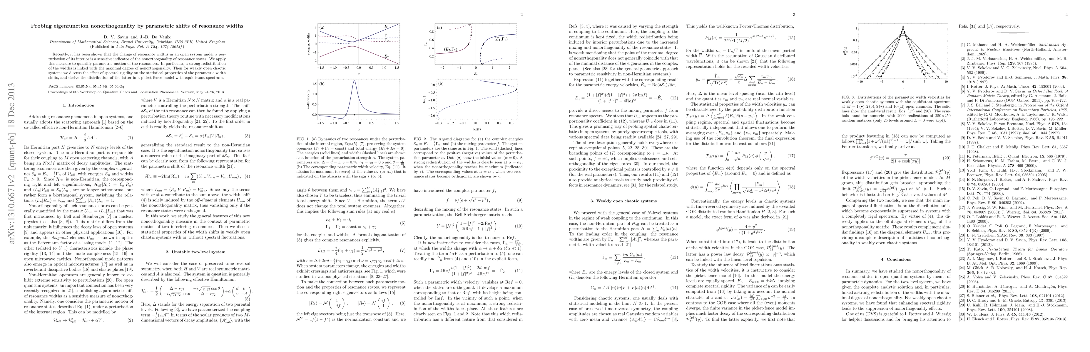 Recently, it has been shown that the change of resonance widths in an open system under a perturbation of its interior is a sensitive indicator of the nonorthogonality of resonance states. We apply this measure to quantify parametric motion of the resonances. In particular, a strong redistribution of the widths is linked with the maximal degree of nonorthogonality. Then for weakly open chaotic systems we discuss the effect of spectral rigidity on the statistical properties of the parametric width shifts, and derive the distribution of the latter in a picket-fence model with equidistant spectrum.
