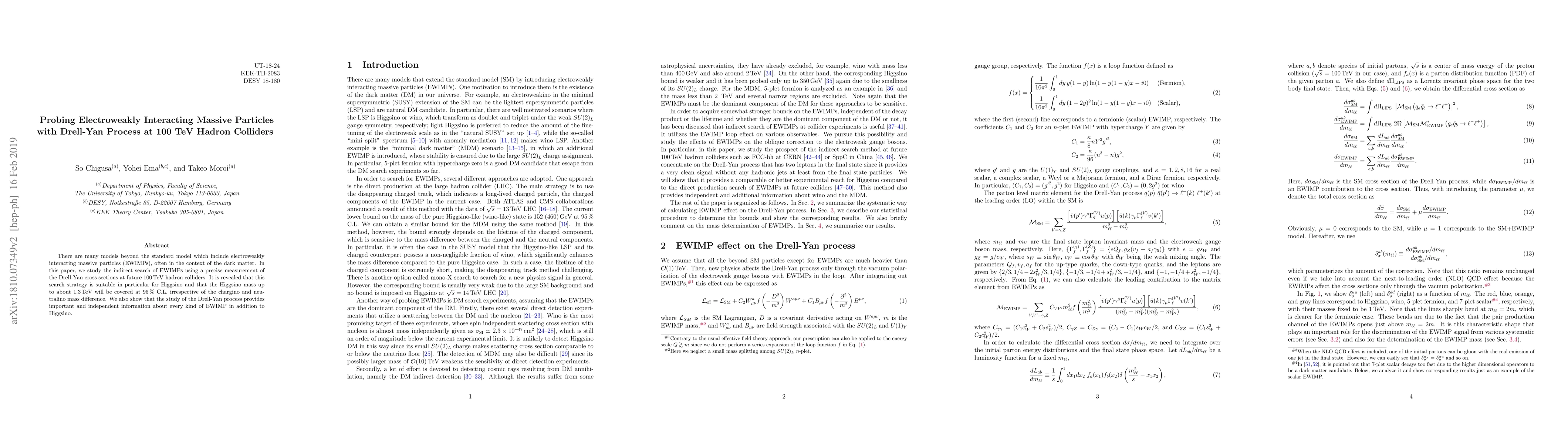 This paper explores the indirect detection of electroweakly interacting massive particles (EWIMPs), particularly Higgsino, using precise Drell-Yan cross section measurements at future 100 TeV hadron colliders. It demonstrates that this approach can cover Higgsino masses up to 1.3 TeV at 95% confidence level, providing independent insights into various EWIMPs.
