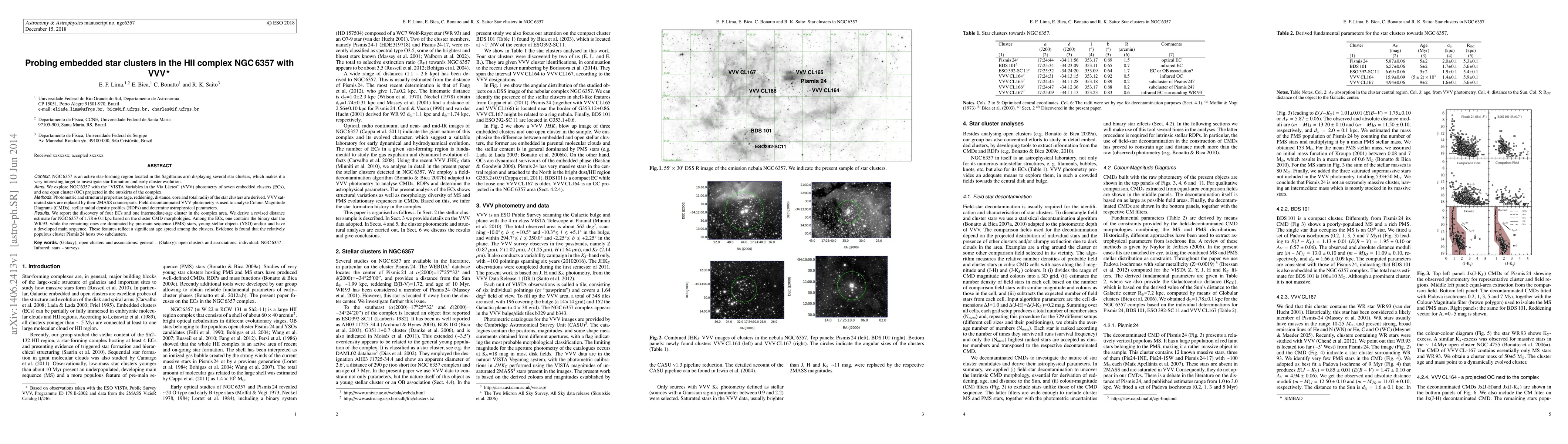This paper investigates NGC 6357, an active star-forming region in the Sagittarius arm, using VVV photometry to analyze seven embedded clusters and one open cluster. The study reveals a revised distance estimate of 1.78±0.1 kpc and identifies significant age diversity among the clusters, including the discovery of four new embedded clusters.