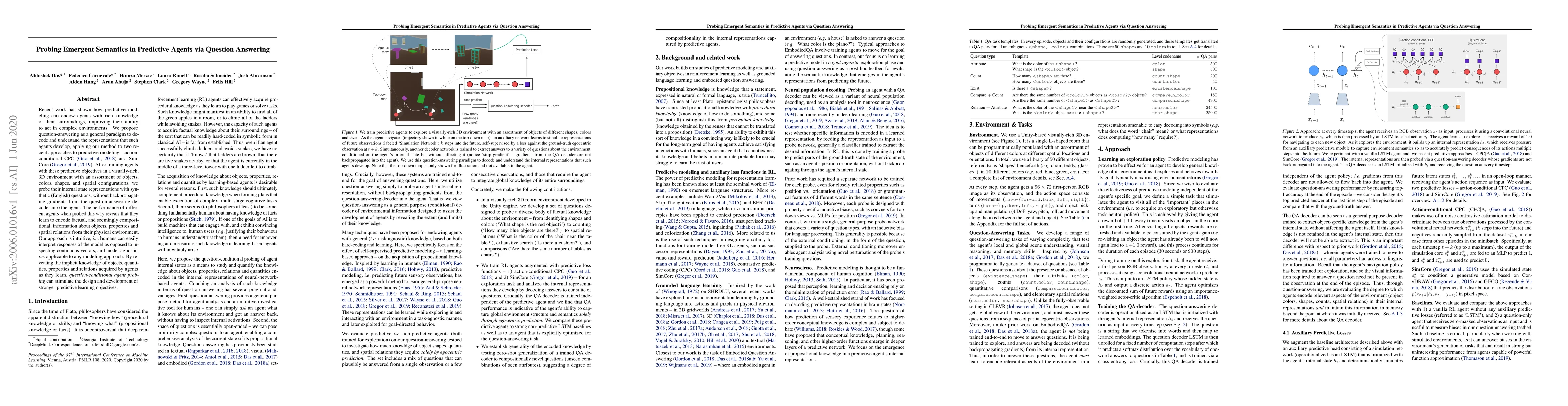 This research introduces a method using question-answering to understand the internal representations of predictive agents in complex environments. Trained in a 3D visual setting, these agents demonstrate the ability to encode factual and compositional information about objects, properties, and spatial relations. The approach is intuitive and model-agnostic, offering insights into the implicit knowledge acquired by agents, which can guide the development of better predictive learning objectives.