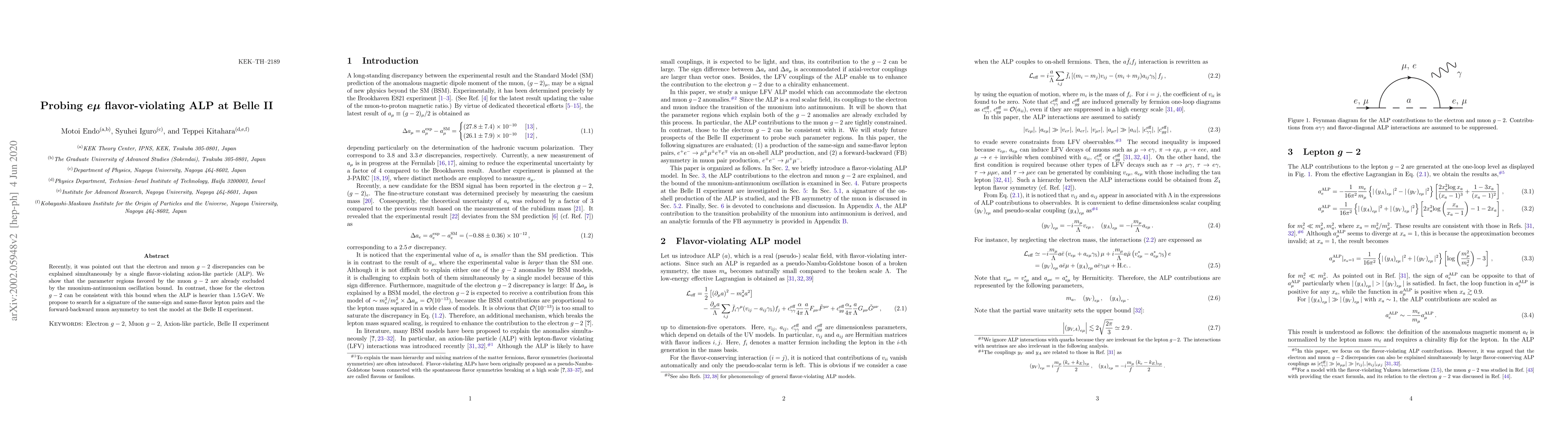 This paper explores the possibility of a flavor-violating axion-like particle (ALP) explaining discrepancies in electron and muon g-2 measurements. It finds that while muon g-2 favored regions are excluded by muonium-antimuonium oscillation bounds, electron g-2 regions may be consistent if the ALP is heavier than 1.5 GeV. The study proposes using Belle II to search for same-sign and same-flavor lepton pairs and forward-backward muon asymmetry to test this model.