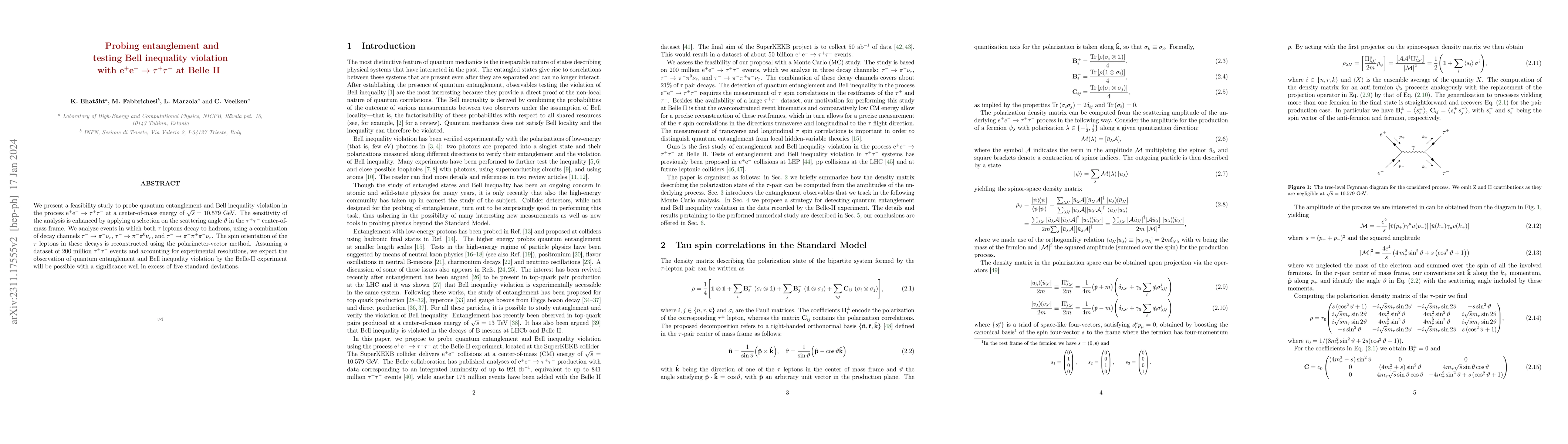 We present a feasibility study to probe quantum entanglement and Belle inequality violation in the process $\textrm{e}^{+}\textrm{e}^{-} \rightarrow \tau^{+}\tau^{-}$ at a center-of-mass energy of $\sqrt{s} = 10.579$ GeV. The sensitivity of the analysis is enhanced by applying a selection on the scattering angle $\vartheta$ in the $\tau^{+}\tau^{-}$ center-of-mass frame. We analyze events in which both $\tau$ leptons decay to hadrons, using a combination of decay channels $\tau^{-} \rightarrow \pi^{-}\nu_{\tau}$, $\tau^{-} \rightarrow \pi^{-}\pi^{0}\nu_{\tau}$, and $\tau^{-} \rightarrow \pi^{-}\pi^{+}\pi^{-}\nu_{\tau}$. The spin orientation of the $\tau$ leptons in these decays is reconstructed using the polarimeter-vector method. Assuming a dataset of $200$ million $\tau^{+}\tau^{-}$ events and accounting for experimental resolutions, we expect the observation of quantum entanglement and Bell inequality violation by the Belle-II experiment will be possible with a significance well in excess of five standard deviations.