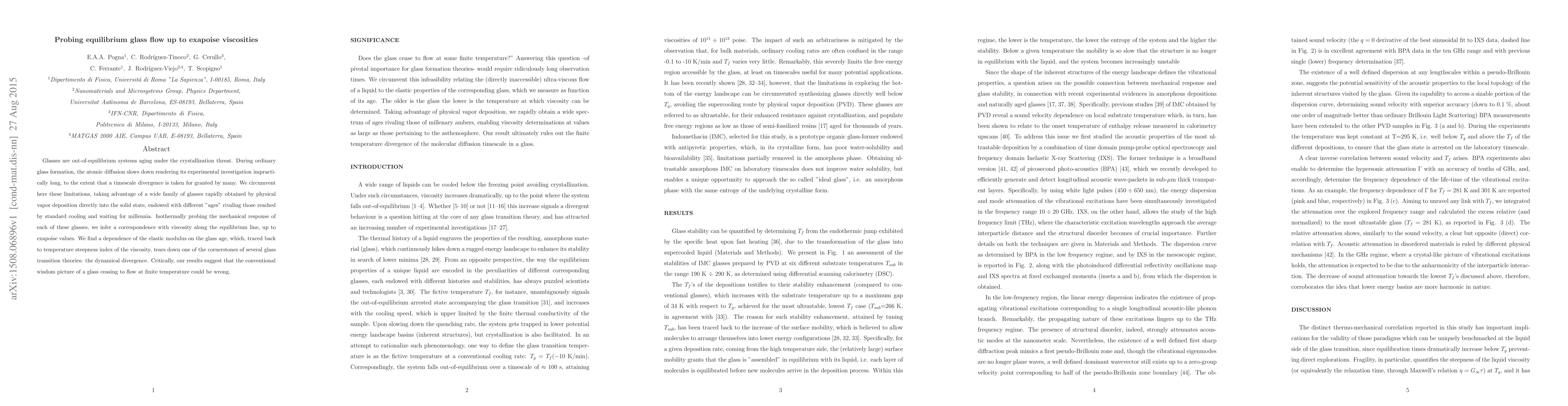 This paper investigates the equilibrium flow properties of glasses using rapidly formed glasses via physical vapor deposition, revealing a correspondence between mechanical response and viscosity up to exapoise values. Contrary to conventional theories, the study suggests that glasses may not cease to flow at finite temperatures, challenging the notion of dynamical divergence.