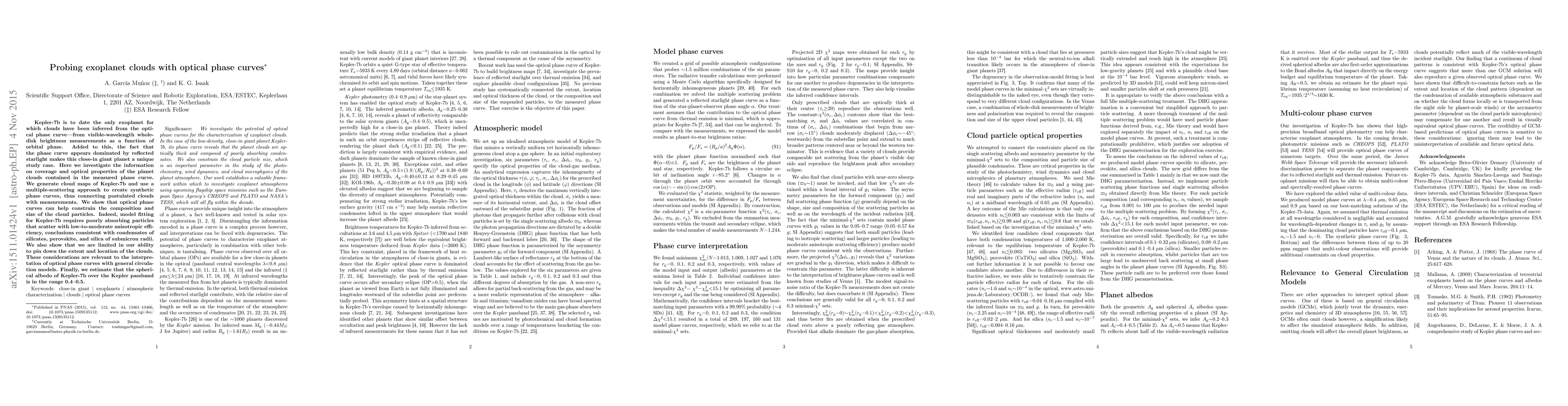 Kepler-7b is to date the only exoplanet for which clouds have been inferred from the optical phase curve -- from visible-wavelength whole-disk brightness measurements as a function of orbital phase. Added to this, the fact that the phase curve appears dominated by reflected starlight makes this close-in giant planet a unique study case. Here we investigate the information on coverage and optical properties of the planet clouds contained in the measured phase curve. We generate cloud maps of Kepler-7b and use a multiple-scattering approach to create synthetic phase curves, thus connecting postulated clouds with measurements. We show that optical phase curves can help constrain the composition and size of the cloud particles. Indeed, model fitting for Kepler-7b requires poorly absorbing particles that scatter with low-to-moderate anisotropic efficiency, conclusions consistent with condensates of silicates, perovskite, and silica of submicron radii. We also show that we are limited in our ability to pin down the extent and location of the clouds. These considerations are relevant to the interpretation of optical phase curves with general circulation models. Finally, we estimate that the spherical albedo of Kepler-7b over the Kepler passband is in the range 0.4--0.5.