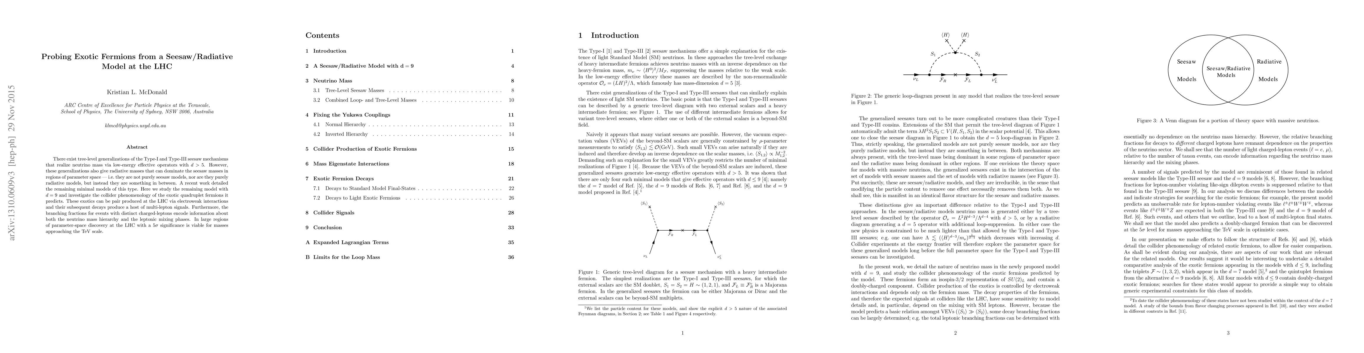 There exist tree-level generalizations of the Type-I and Type-III seesaw mechanisms that realize neutrino mass via low-energy effective operators with d>5. However, these generalizations also give radiative masses that can dominate the seesaw masses in regions of parameter space --- i.e. they are not purely seesaw models, nor are they purely radiative models, but instead they are something in between. A recent work detailed the remaining minimal models of this type. Here we study the remaining model with d=9 and investigate the collider phenomenology of the exotic quadruplet fermions it predicts. These exotics can be pair produced at the LHC via electroweak interactions and their subsequent decays produce a host of multi-lepton signals. Furthermore, the branching fractions for events with distinct charged-leptons encode information about both the neutrino mass hierarchy and the leptonic mixing phases. In large regions of parameter-space discovery at the LHC with a 5 sigma significance is viable for masses approaching the TeV scale.