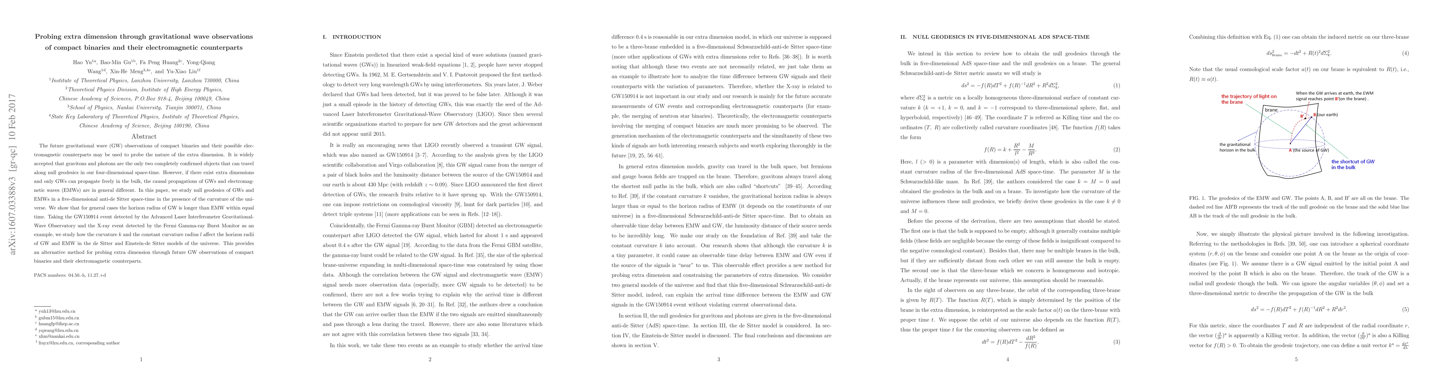 This paper explores how future gravitational wave observations of compact binaries and their electromagnetic counterparts can reveal the existence of extra dimensions. It demonstrates that gravitational waves (GWs) and electromagnetic waves (EMWs) propagate differently in higher-dimensional space-time, providing a novel method to probe extra dimensions through the comparison of GW and EMW horizon radii in various cosmological models.