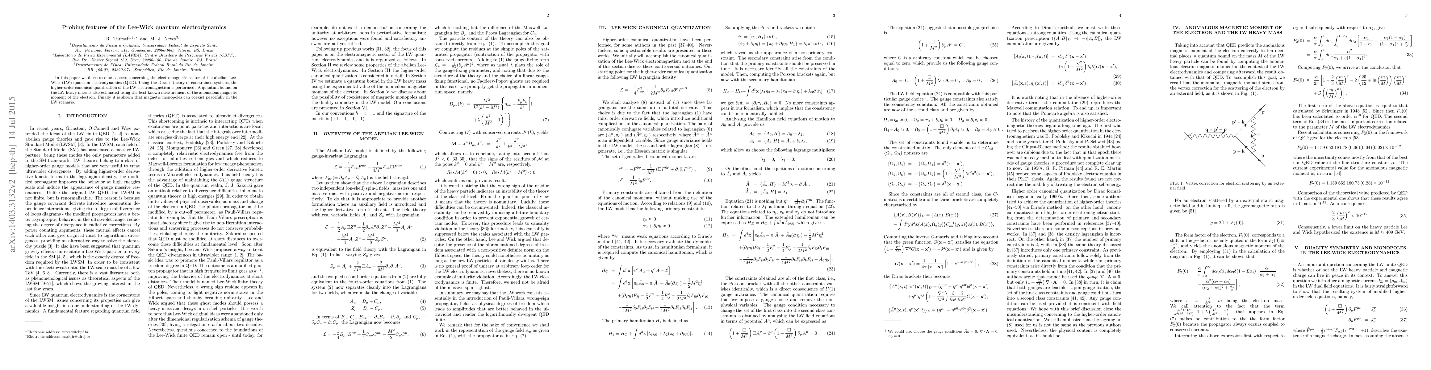In this paper we discuss some aspects concerning the electromagnetic sector of the abelian Lee-Wick (LW) quantum electrodynamics (QED). Using the Dirac's theory of constrained systems, the higher-order canonical quantization of the LW electromagnetism is performed. A quantum bound on the LW heavy mass is also estimated using the best known measurement of the anomalous magnetic moment of the electron. Finally it is shown that magnetic monopoles can coexist peacefully in the LW scenario.