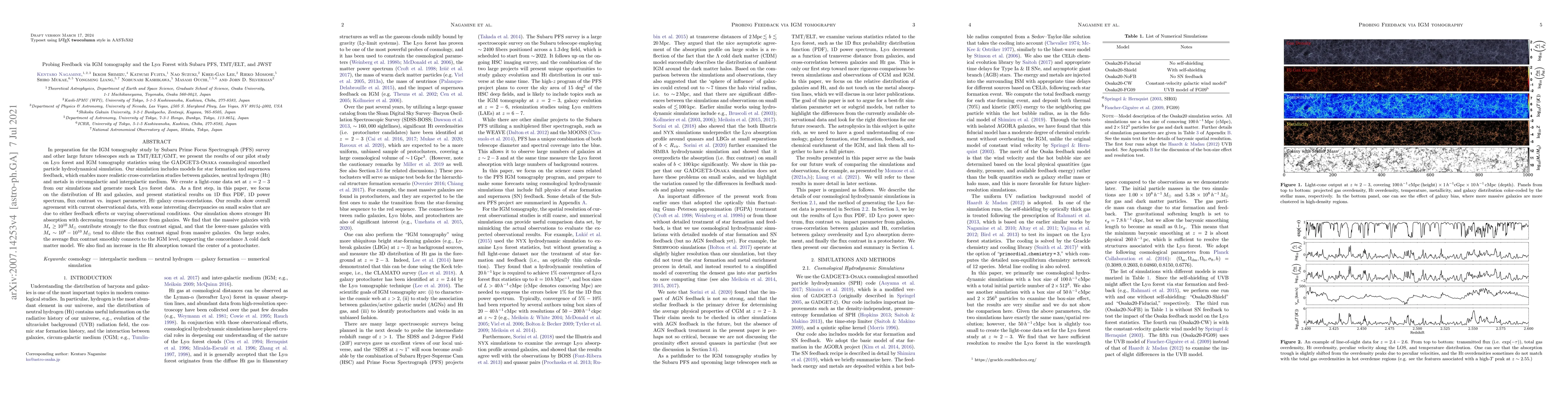 In preparation for the IGM tomography study by Subaru Prime Focus Spectrograph (PFS) survey and other large future telescopes such as TMT/ELT/GMT, we present the results of our pilot study on Ly$\alpha$ forest and IGM tomography statistics using the GADGET3-OSAKA cosmological smoothed particle hydrodynamical simulation. Our simulation includes models for star formation and supernova feedback, which enables more realistic cross-correlation studies between galaxies, neutral hydrogen (HI) and metals in circumgalactic and intergalactic medium. We create a light-cone data set at $z=2-3$ from our simulations and generate mock Ly$\alpha$ forest data. As a first step, in this paper, we focus on the distribution of HI and galaxies, and present statistical results on 1D flux PDF, 1D power spectrum, flux contrast vs. impact parameter, HI$-$galaxy cross-correlations. Our results show overall agreement with current observational data, with some interesting discrepancies on small scales that are due to either feedback effects or varying observational conditions. Our simulation shows stronger HI absorption with decreasing transverse distance from galaxies. We find that the massive galaxies with $M_\star \ge 10^{10}\,M_\odot$ contribute strongly to the flux contrast signal, and that the lower-mass galaxies with $M_\star \sim 10^8-10^{10}\,M_\odot$ tend to dilute the flux contrast signal from massive galaxies. On large scales, the average flux contrast smoothly connects to the IGM level, supporting the concordance $\Lambda$ cold dark matter model. We also find an increase in the HI absorption toward the center of a protocluster.