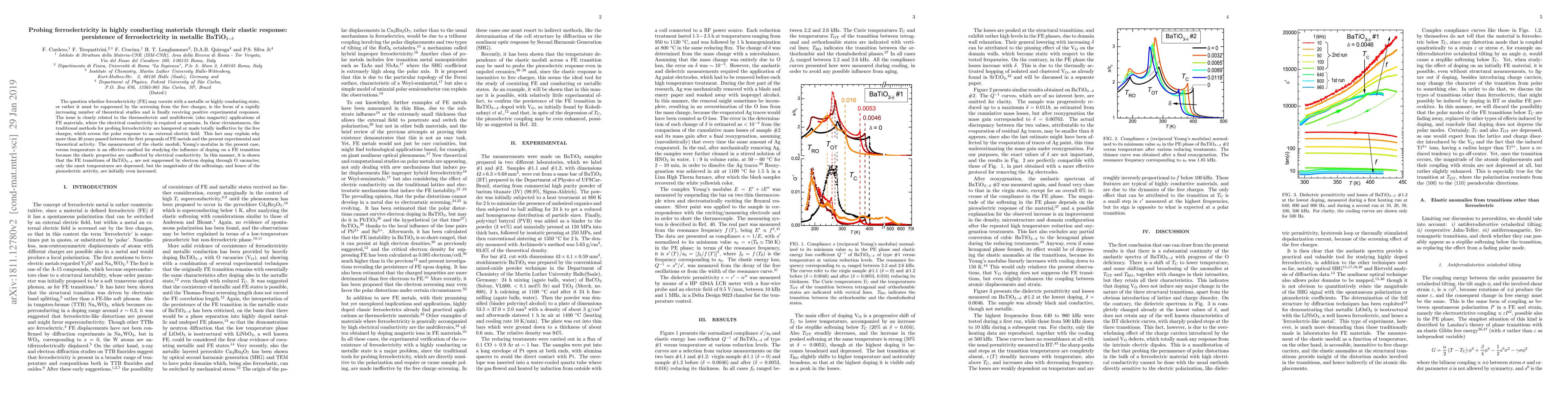 The question whether ferroelectricity (FE) may coexist with a metallic or highly conducting state, or rather it must be suppressed by the screening from the free charges, is the focus of a rapidly increasing number of theoretical studies and is finally receiving positive experimental responses. The issue is closely related to the thermoelectric and multiferroic (also magnetic) applications of FE materials, where the electrical conductivity is required or spurious. In these circumstances, the traditional methods for probing ferroelectricity are hampered or made totally ineffective by the free charges, which screen the polar response to an external electric field. This fact may explain why more than 40 years passed between the first proposals of FE metals and the present experimental and theoretical activity. The measurement of the elastic moduli, Young's modulus in the present case, versus temperature is an effective method for studying the influence of doping on a FE transition because the elastic properties are unaffected by electrical conductivity. In this manner, it is shown that the FE transitions of BaTiO3-d are not suppressed by electron doping through O vacancies; only the onset temperatures are depressed, but the magnitudes of the softenings, and hence of the piezoelectric activity, are initially even increased.