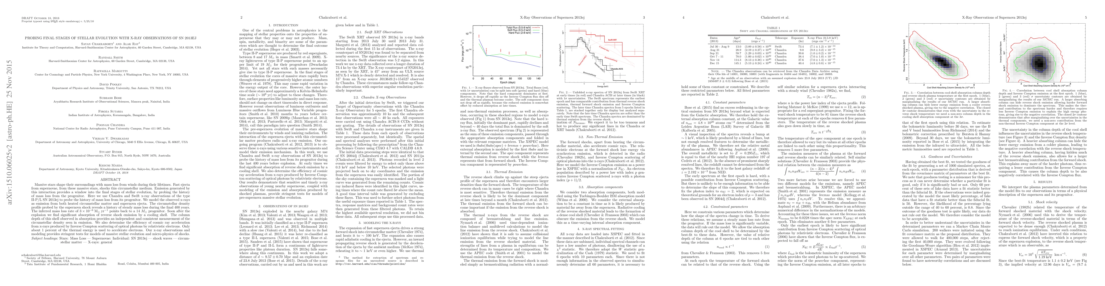 Massive stars shape their surroundings with mass loss from winds during their lifetimes. Fast ejecta from supernovae, from these massive stars, shocks this circumstellar medium. Emission generated by this interaction provides a window into the final stages of stellar evolution, by probing the history of mass loss from the progenitor. Here we use Chandra and Swift x-ray observations of the type II-P/L SN 2013ej to probe the history of mass loss from its progenitor. We model the observed x-rays as emission from both heated circumstellar matter and supernova ejecta. The circumstellar density profile probed by the supernova shock reveals a history of steady mass loss during the final 400 years. The inferred mass loss rate of $3 \times 10^{-6} {\rm \; M_\odot \; yr^{-1}}$ points back to a 14 $M_\odot$ progenitor. Soon after the explosion we find significant absorption of reverse shock emission by a cooling shell. The column depth of this shell observed in absorption provides an independent and consistent measurement of the circumstellar density seen in emission. We also determine the efficiency of cosmic ray acceleration from x-rays produced by Inverse Compton scattering of optical photons by relativistic electrons. Only about 1 percent of the thermal energy is used to accelerate electrons. Our x-ray observations and modeling provides stringent tests for models of massive stellar evolution and micro-physics of shocks.