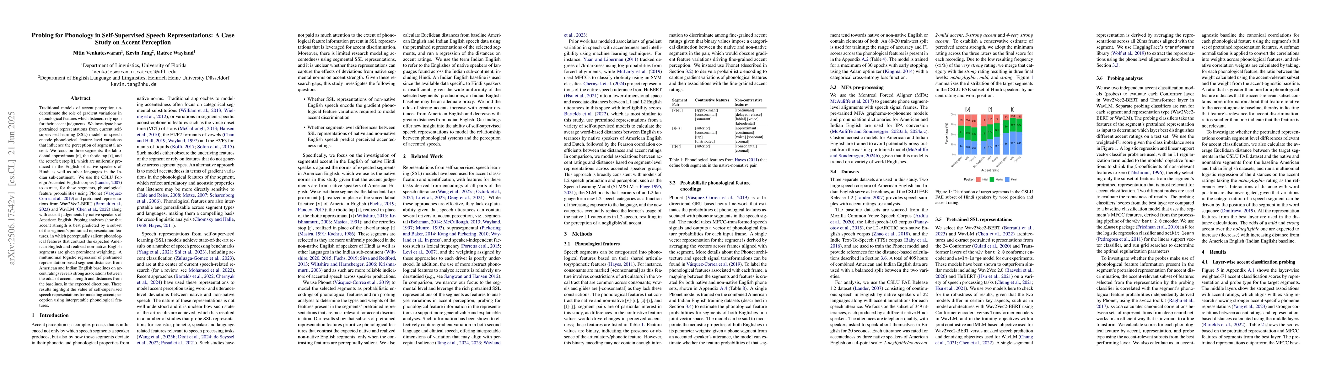 Traditional models of accent perception underestimate the role of gradient variations in phonological features which listeners rely upon for their accent judgments. We investigate how pretrained representations from current self-supervised learning (SSL) models of speech encode phonological feature-level variations that influence the perception of segmental accent. We focus on three segments: the labiodental approximant, the rhotic tap, and the retroflex stop, which are uniformly produced in the English of native speakers of Hindi as well as other languages in the Indian sub-continent. We use the CSLU Foreign Accented English corpus (Lander, 2007) to extract, for these segments, phonological feature probabilities using Phonet (V\'asquez-Correa et al., 2019) and pretrained representations from Wav2Vec2-BERT (Barrault et al., 2023) and WavLM (Chen et al., 2022) along with accent judgements by native speakers of American English. Probing analyses show that accent strength is best predicted by a subset of the segment's pretrained representation features, in which perceptually salient phonological features that contrast the expected American English and realized non-native English segments are given prominent weighting. A multinomial logistic regression of pretrained representation-based segment distances from American and Indian English baselines on accent ratings reveals strong associations between the odds of accent strength and distances from the baselines, in the expected directions. These results highlight the value of self-supervised speech representations for modeling accent perception using interpretable phonological features.