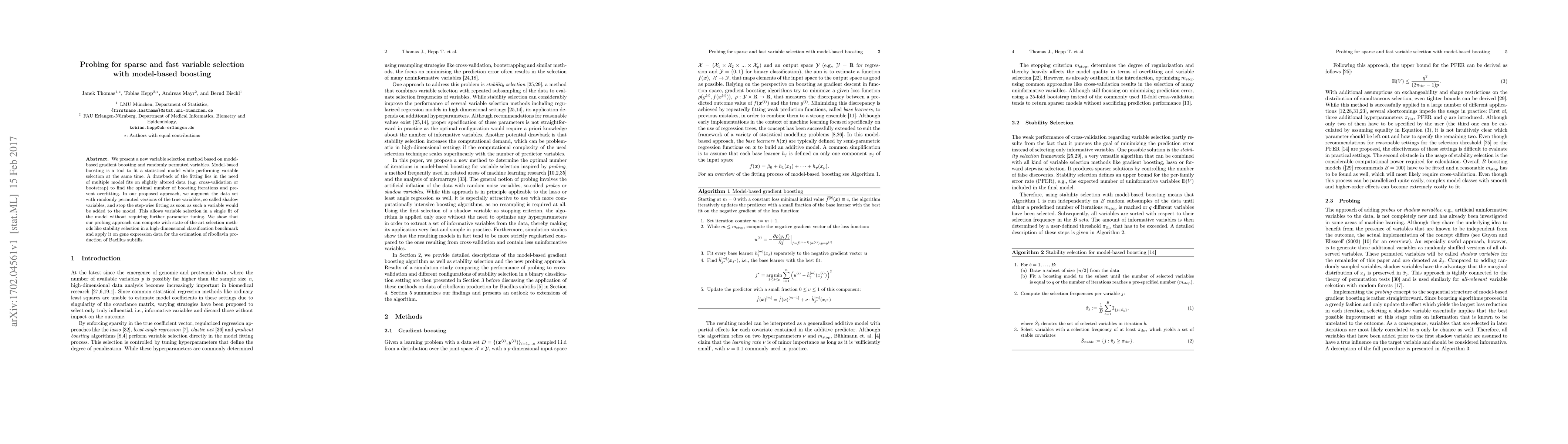 This paper introduces a new variable selection method using model-based gradient boosting with randomly permuted shadow variables to avoid overfitting. The method selects variables in a single model fit without additional parameter tuning, competing effectively with state-of-the-art methods in high-dimensional classification tasks.