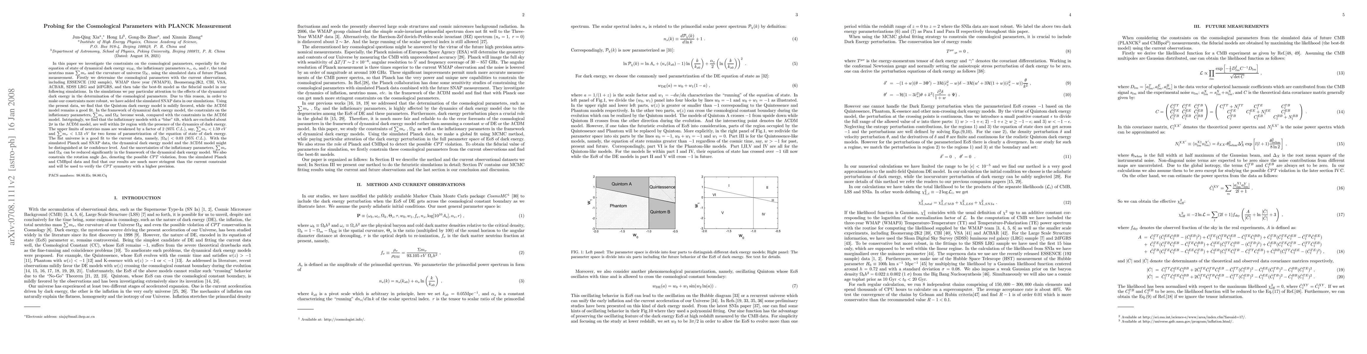 We investigate the constraints on cosmological parameters especially for EoS of dark energy, inflationary parameters, neutrino mass and curvature of universe using simulated Planck data. Firstly we determine cosmological parameters with current observations including ESSENCE, WMAP3, Boomerang-2K2, CBI, VSA, ACBAR, SDSS LRG and 2dFGRS, and take best-fit model as the fiducial model in simulations. In simulations we pay attention to the effects of dynamical dark energy in determination of cosmological parameters. We add simulated SNAP data to do all the simulations. Using present data, we find Quintom dark energy model is mildly favored while \LambdaCDM remains a good fit. In the framework of dynamical dark energy, the constraints on inflationary parameters, m_{\nu} and \Omega_{K} become weak compared with the constraints in \LambdaCDM. Intriguingly, we find that the inflationary models with a "blue" tilt, which are excluded about 2\sigma in \LambdaCDM model, are well within 2\sigma region with the presence of the dynamics of dark energy. The upper limits of neutrino mass are weakened by a factor of 2 (95% C.L.), say, m_{\nu}<1.59 eV and m_{\nu}<1.53 eV for two forms of parametrization of the equation of state of dark energy. The flat universe is a good fit to the current data, namely, |\Omega_{K}|<0.03 (95% C.L.). With the simulated Planck and SNAP data, dynamical dark energy and \LambdaCDM might be distinguished at 4\sigma. And uncertainties of inflationary parameters, m_{\nu} and \Omega_{K} can be reduced obviously. We also constrain the rotation angle \Delta\alpha, denoting possible cosmological CPT violation, with simulated Planck and CMBpol data and find that our results are much more stringent than current constraint and will verify cosmological CPT symmetry with a higher precision. (Abridged)
