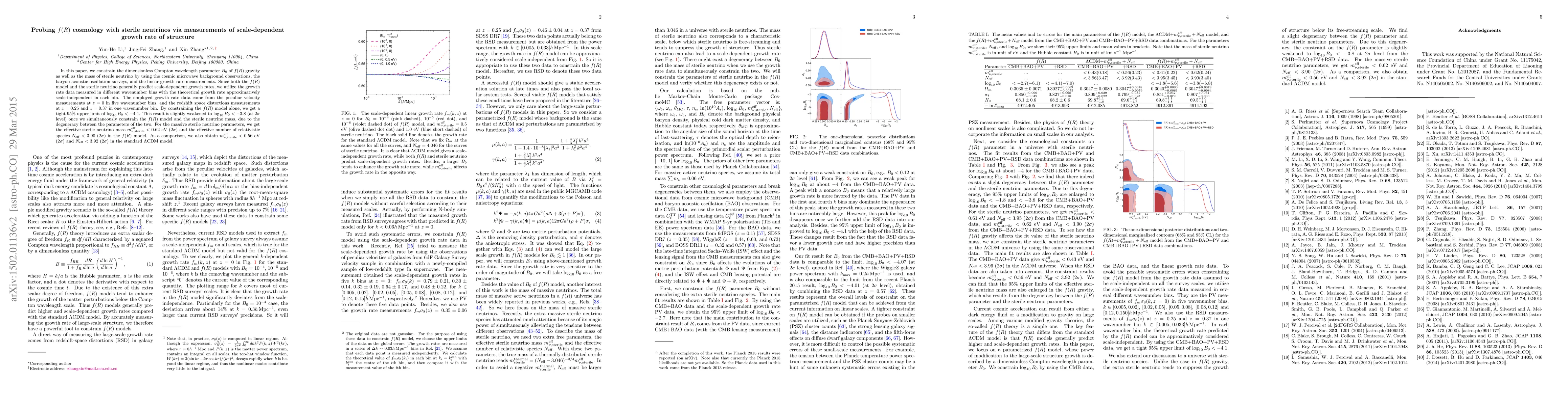 This paper constrains the $f(R)$ gravity model and the mass of sterile neutrinos using cosmic microwave background observations, baryon acoustic oscillation surveys, and measurements of the scale-dependent growth rate of structure. The study finds a 95% upper limit of $\log_{10}B_0<-4.1$ for $f(R)$ alone, which weakens to $\log_{10}B_0<-3.8$ when considering sterile neutrinos due to parameter degeneracies.