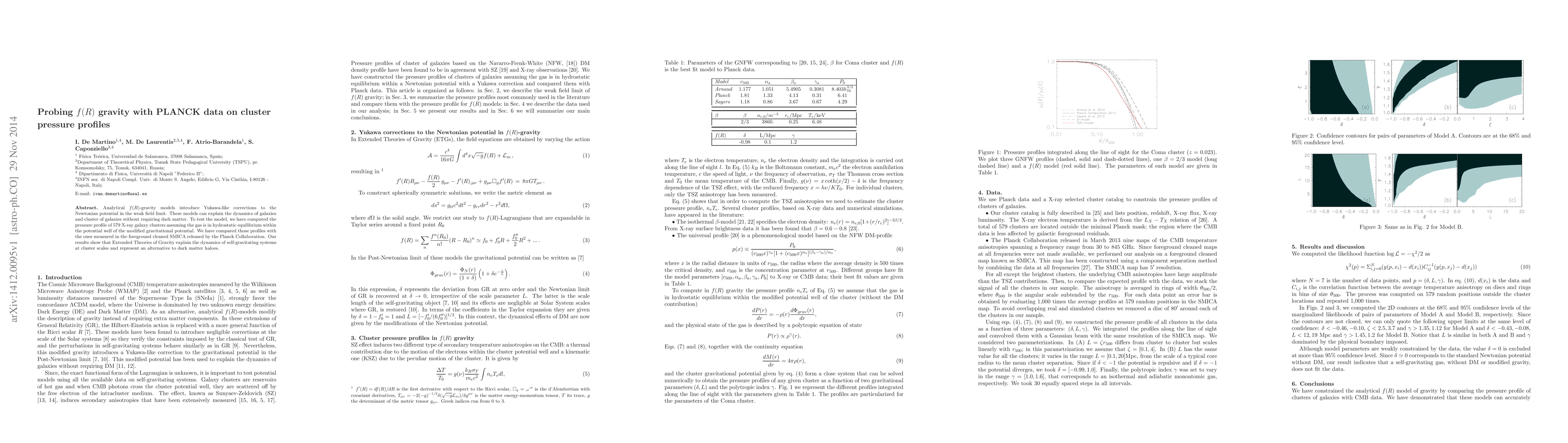 Analytical $f(R)$-gravity models introduce Yukawa-like corrections to the Newtonian potential in the weak field limit. These models can explain the dynamics of galaxies and cluster of galaxies without requiring dark matter. To test the model, we have computed the pressure profile of 579 X-ray galaxy clusters assuming the gas is in hydrostatic equilibrium within the potential well of the modified gravitational potential. We have compared those profiles with the ones measured in the foreground cleaned SMICA released by the Planck Collaboration. Our results show that Extended Theories of Gravity explain the dynamics of self-gravitating systems at cluster scales and represent an alternative to dark matter haloes.