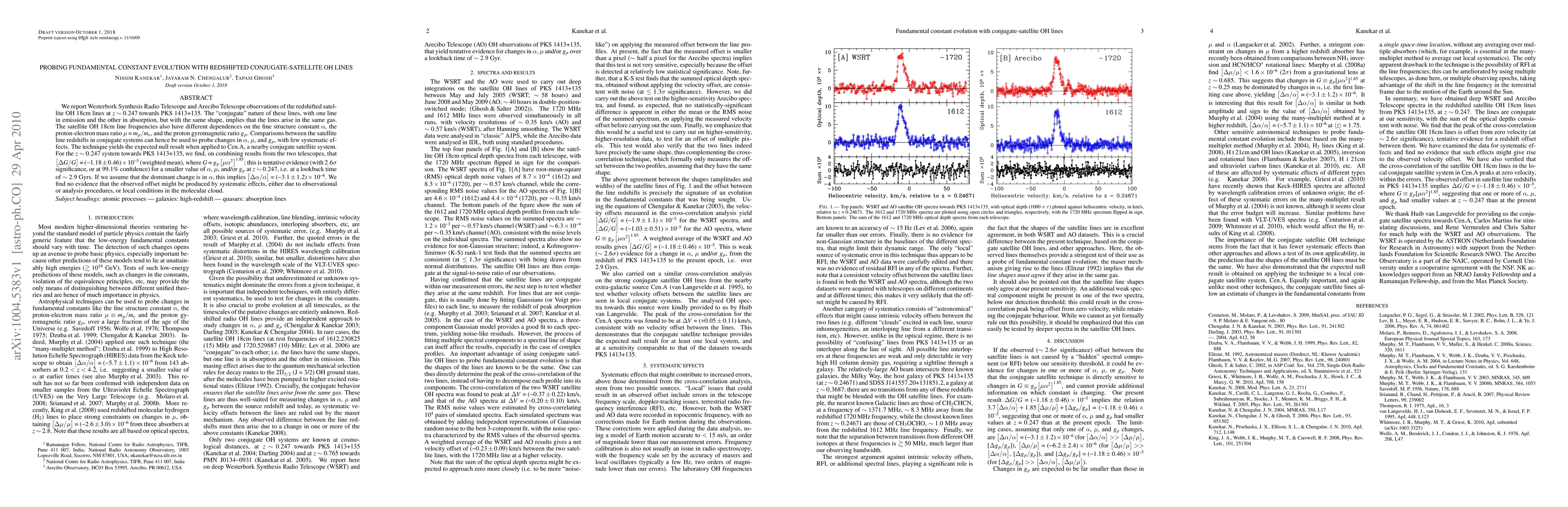 This paper investigates the redshifted OH-18cm lines in satellite systems using observations from the Westerbork and Arecibo telescopes to probe possible changes in fundamental constants like $\alpha$, $\mu$, and $g_p$. The study finds tentative evidence for a smaller value of these constants at a redshift of $z \sim 0.247$, suggesting a potential decrease in the fine structure constant by $(-3.1 \pm 1.2) \times 10^{-6}$.