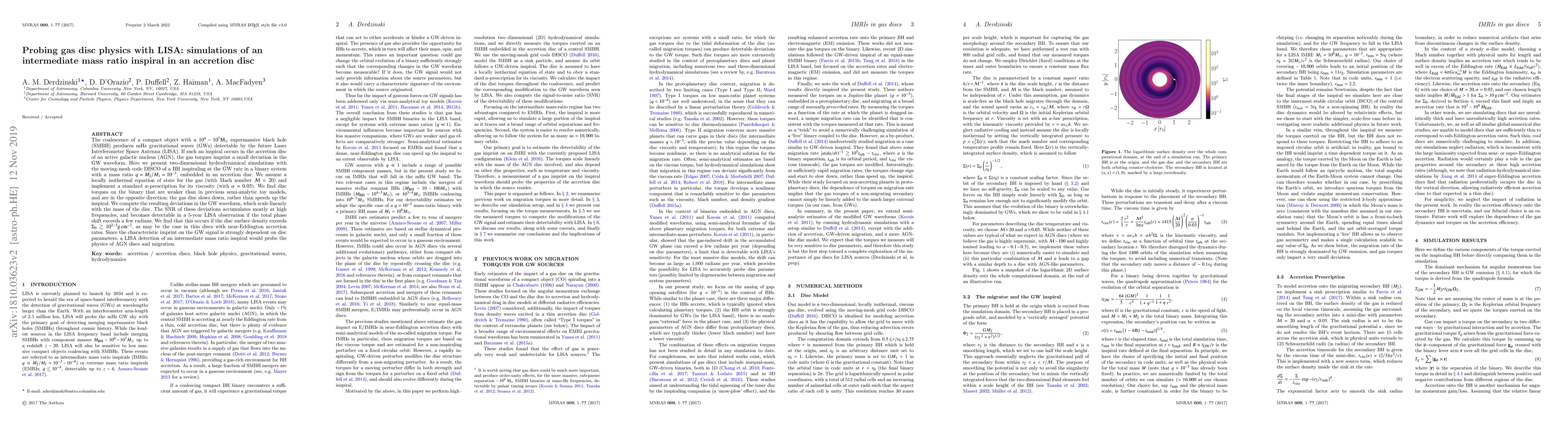 This paper uses hydrodynamical simulations to investigate how gas accretion discs affect gravitational wave (GW) signals from intermediate mass ratio inspirals detectable by LISA. The simulations show that gas disc torques slow down the inspiral, contrary to previous models, and detectable GW deviations occur if the disc's surface density exceeds $10^{2-3}\rm g\,cm^{-2}$.