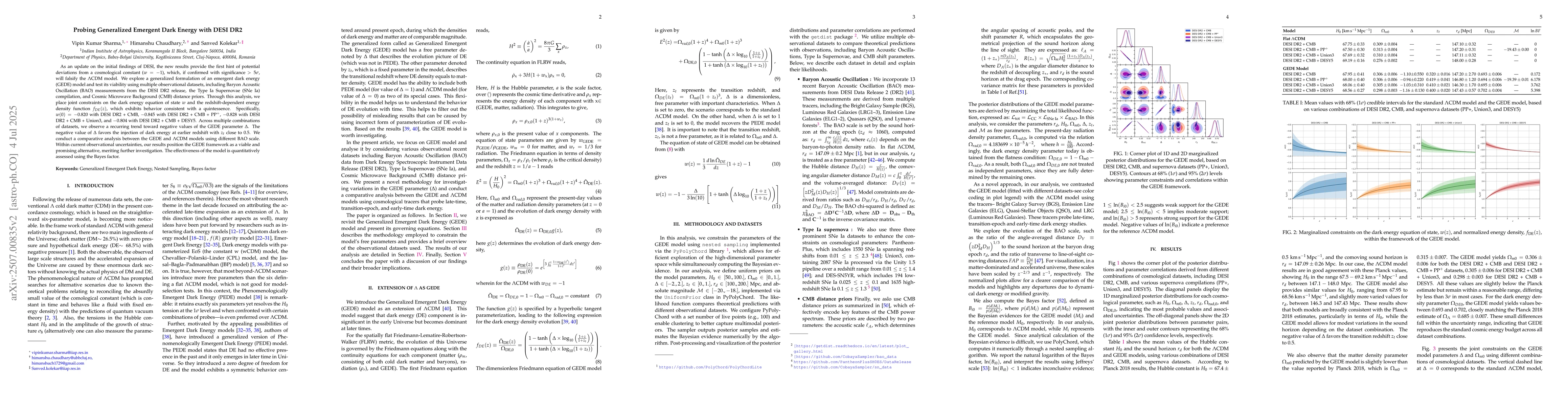 As an update on the initial findings of DESI, the new results provide the first hint of potential deviations from a cosmological constant ($w=-1$), which, if confirmed with significance $>5\sigma$, will falsify the $\Lambda$CDM model. We consider a novel generalised form of an emergent dark energy model and confront this through various data sets (Baryon Acoustic Oscillation (BAO) data from Dark Energy Spectroscopic Instrument Data Release (DESI DR2), Type Ia Supernovae (SNe Ia) compilation, and Cosmic Microwave Background (CMB) distance priors) and simultaneously constrain the dark energy (DE) equation of state and energy density $f_{DE}(z)$. The results for the joint posteriors of cosmological parameters and the reconstructed dark energy EoS $w(z)$ with the energy density $f_{DE}(z)$ for various combinations of data sets are discussed, which favors quintessence nature. Specifically, $w(0) = -0.820$ with DESI DR2 + CMB, $-0.845$ with DESI DR2 + CMB + PP$^+$, $-0.828$ with DESI DR2 + CMB + Union3, and $-0.804$ with DESI DR2 + CMB + DESY5. We adopted a novel method to probe shifts in the generalized emergent dark energy (GEDE) parameter ($\Delta$) by mapping 2D marginalized posterior distributions in the $\Delta-\Omega_{m0}$ plane. Our analysis consistently reveals a preference for negative $\Delta$ across multiple combinations of observational datasets. Incorporating these values into the matter power spectrum further supports the GEDE framework's viability. We quantify the model's performance using the Bayes factor.