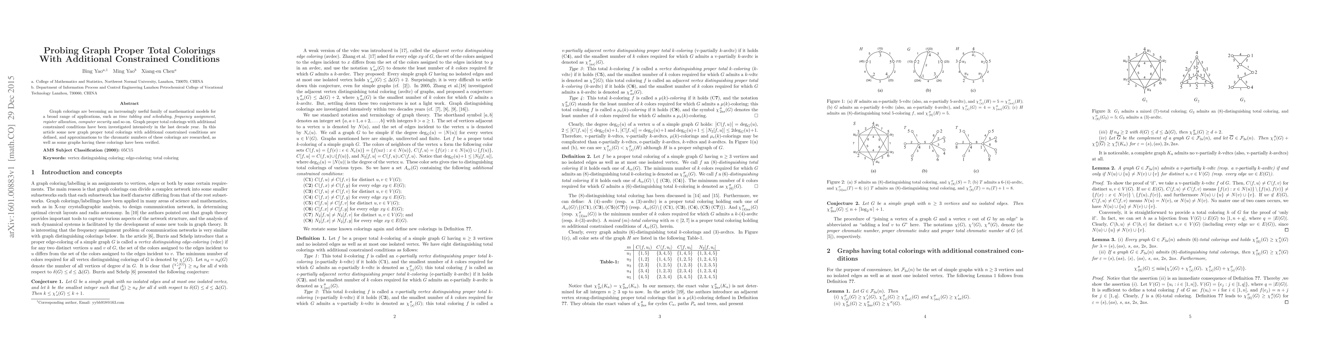 Graph colorings are becoming an increasingly useful family of mathematical models for a broad range of applications, such as time tabling and scheduling, frequency assignment, register allocation, computer security and so on. Graph proper total colorings with additional constrained conditions have been investigated intensively in the last decade year. In this article some new graph proper total colorings with additional constrained conditions are defined, and approximations to the chromatic numbers of these colorings are researched, as well as some graphs having these colorings have been verified.