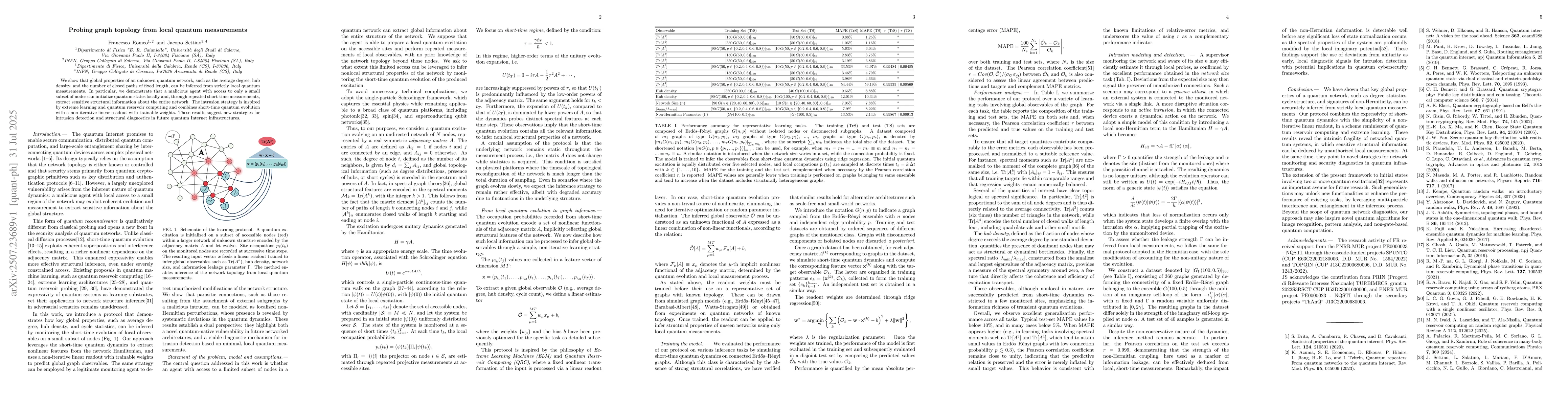We show that global properties of an unknown quantum network, such as the average degree, hub density, and the number of closed paths of fixed length, can be inferred from strictly local quantum measurements. In particular, we demonstrate that a malicious agent with access to only a small subset of nodes can initialize quantum states locally and, through repeated short-time measurements, extract sensitive structural information about the entire network. The intrusion strategy is inspired by extreme learning and quantum reservoir computing and combines short-time quantum evolution with a non-iterative linear readout with trainable weights. These results suggest new strategies for intrusion detection and structural diagnostics in future quantum Internet infrastructures.
