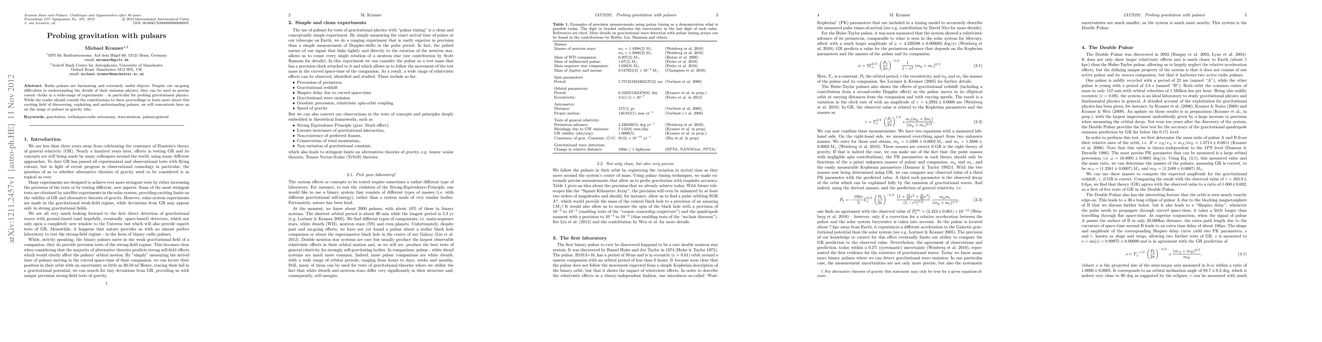 Radio pulsars are fascinating and extremely useful objects. Despite our on-going difficulties in understanding the details of their emission physics, they can be used as precise cosmic clocks in a wide-range of experiments -- in particular for probing gravitational physics. While the reader should consult the contributions to these proceedings to learn more about this exciting field of discovering, exploiting and understanding pulsars, we will concentrate here on on the usage of pulsars as gravity labs.