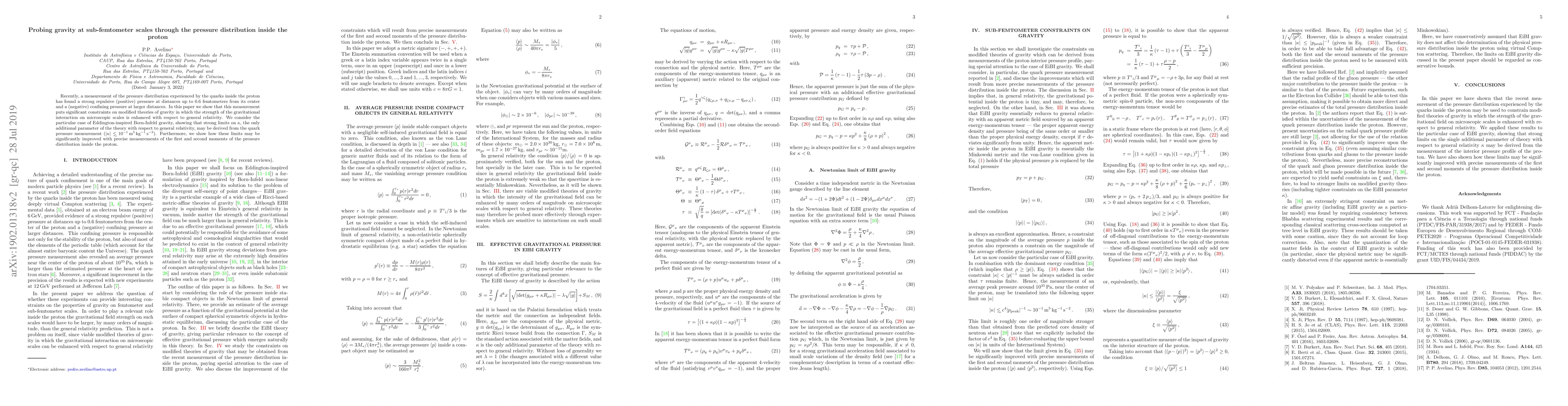Recently, a measurement of the pressure distribution experienced by the quarks inside the proton has found a strong repulsive (positive) pressure at distances up to 0.6 femtometers from its center and a (negative) confining pressure at larger distances. In this paper we show that this measurement puts significant constraints on modified theories of gravity in which the strength of the gravitational interaction on microscopic scales is enhanced with respect to general relativity. We consider the particular case of Eddington-inspired Born-Infeld gravity, showing that strong limits on $\kappa$, the only additional parameter of the theory with respect to general relativity, may be derived from the quark pressure measurement ($|\kappa| \lsim 10^{-1} \, {\rm m^5 \, kg^{-1} \, s^{-2}}$). Furthermore, we show how these limits may be significantly improved with precise measurements of the first and second moments of the pressure distribution inside the proton.