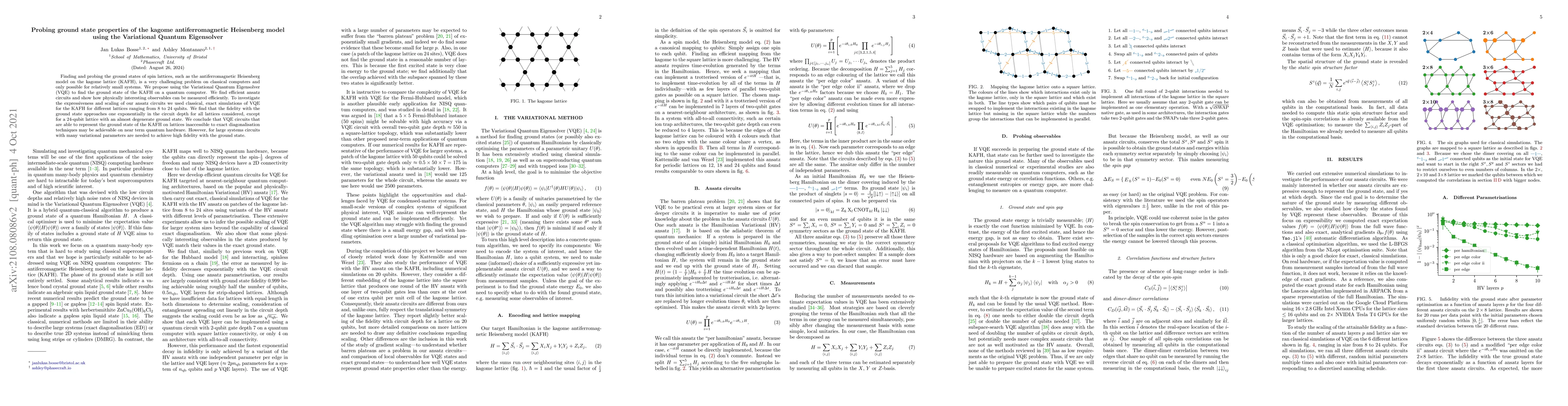 Finding and probing the ground states of spin lattices, such as the antiferromagnetic Heisenberg model on the kagome lattice (KAFH), is a very challenging problem on classical computers and only possible for relatively small systems. We propose using the Variational Quantum Eigensolver (VQE) to find the ground state of the KAFH on a quantum computer. We find efficient ansatz circuits and show how physically interesting observables can be measured efficiently. To investigate the expressiveness and scaling of our ansatz circuits we used classical, exact simulations of VQE for the KAFH for different lattices ranging from 8 to 24 qubits. We find that the fidelity with the ground state approaches one exponentially in the circuit depth for all lattices considered, except for a 24-qubit lattice with an almost degenerate ground state. We conclude that VQE circuits that are able to represent the ground state of the KAFH on lattices inaccessible to exact diagonalisation techniques may be achievable on near term quantum hardware. However, for large systems circuits with many variational parameters are needed to achieve high fidelity with the ground state.
