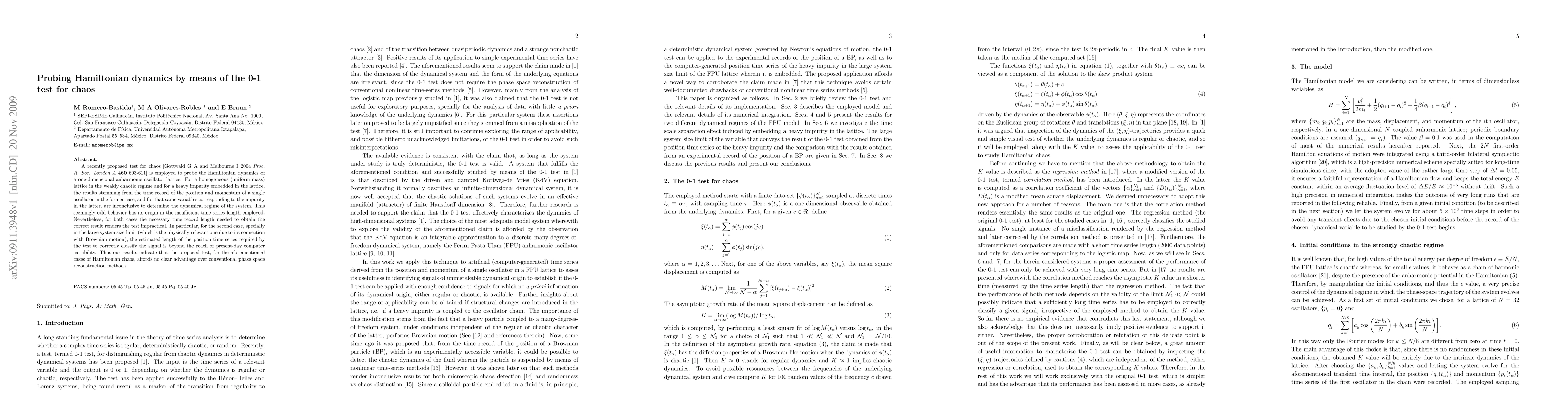 A test for chaos was applied to a one-dimensional anharmonic oscillator lattice, but found insufficient time series length to determine the dynamical regime, rendering it impractical due to computational limitations.