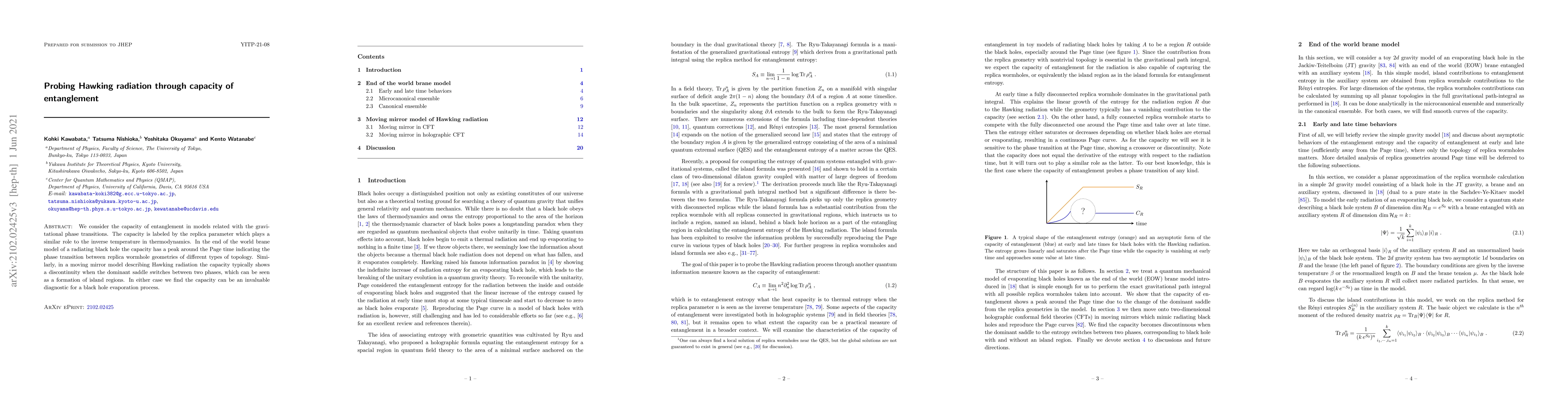 This research explores the use of entanglement capacity as a tool to study Hawking radiation and black hole evaporation. It finds that capacity of entanglement, indicated by a replica parameter, shows significant changes at the Page time in brane models and at saddle point transitions in mirror models, suggesting it could serve as a crucial diagnostic for understanding these complex gravitational phase transitions.