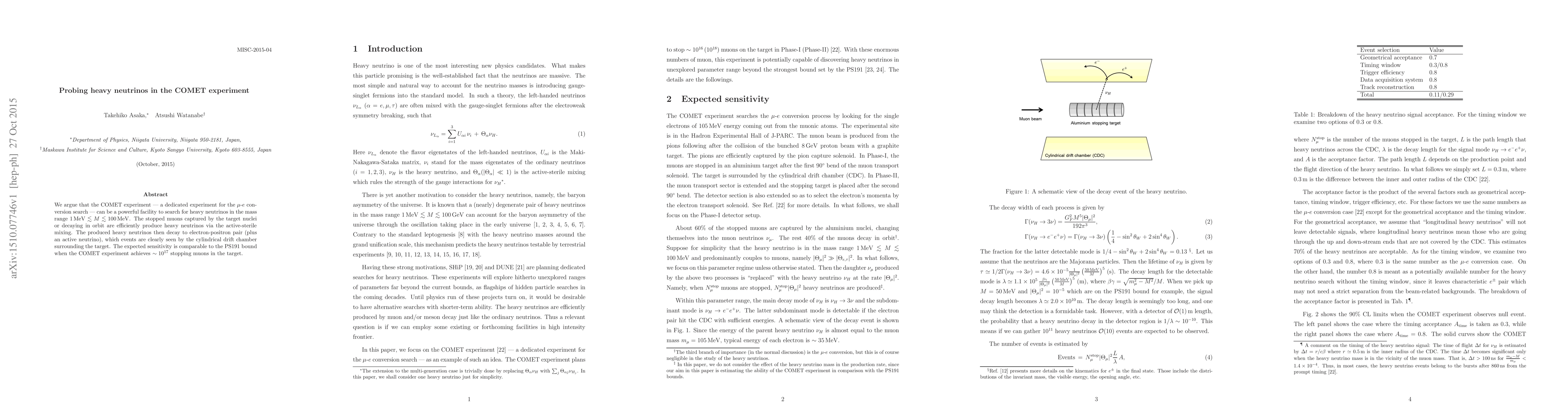 The COMET experiment aims to detect $\mu$-$e$ conversion and can also search for heavy neutrinos in the mass range of 1 MeV to 100 MeV through active-sterile mixing. The experiment's cylindrical drift chamber can detect the decay products of heavy neutrinos, potentially reaching sensitivity comparable to existing PS191 bounds with sufficient muon stopping.