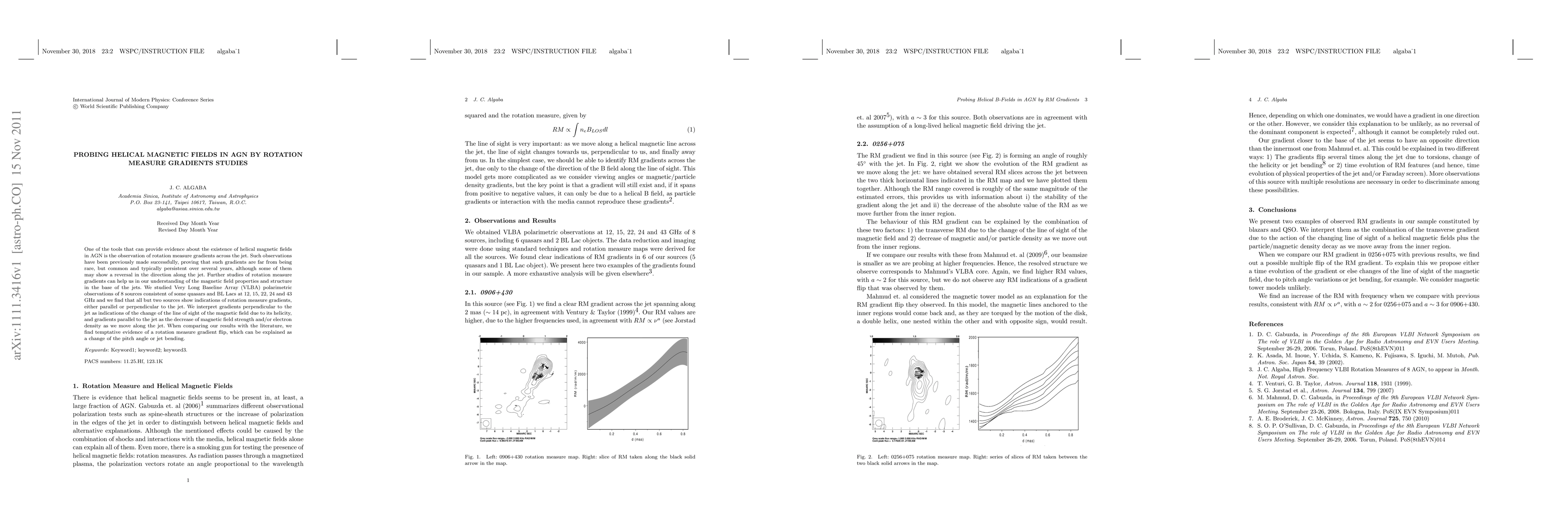 This study uses VLBA polarimetric observations to investigate rotation measure gradients in AGN jets, finding evidence of helical magnetic fields. The analysis of 8 sources reveals persistent rotation measure gradients, suggesting variations in magnetic field strength and electron density along the jet.