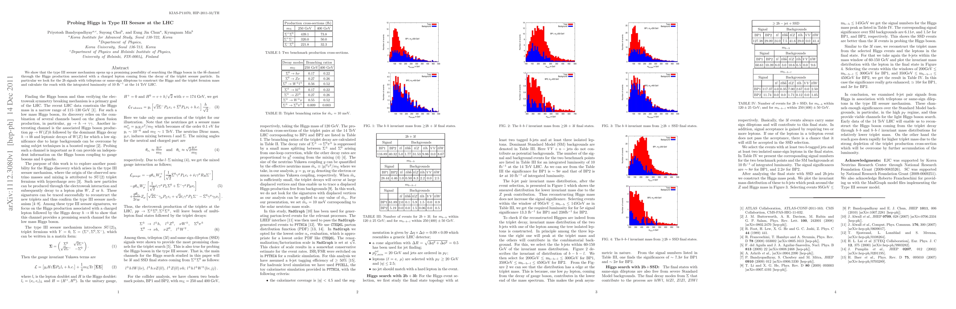 This paper explores the type III seesaw mechanism's potential to detect the Higgs boson via $b \bar b$ channel production, linked to triplet seesaw particle decays, and assesses the LHC's capability with 10 fb$^{-1}$ of integrated luminosity at 14 TeV. The focus is on identifying $2b$ signals accompanied by trileptons or same-sign dileptons.