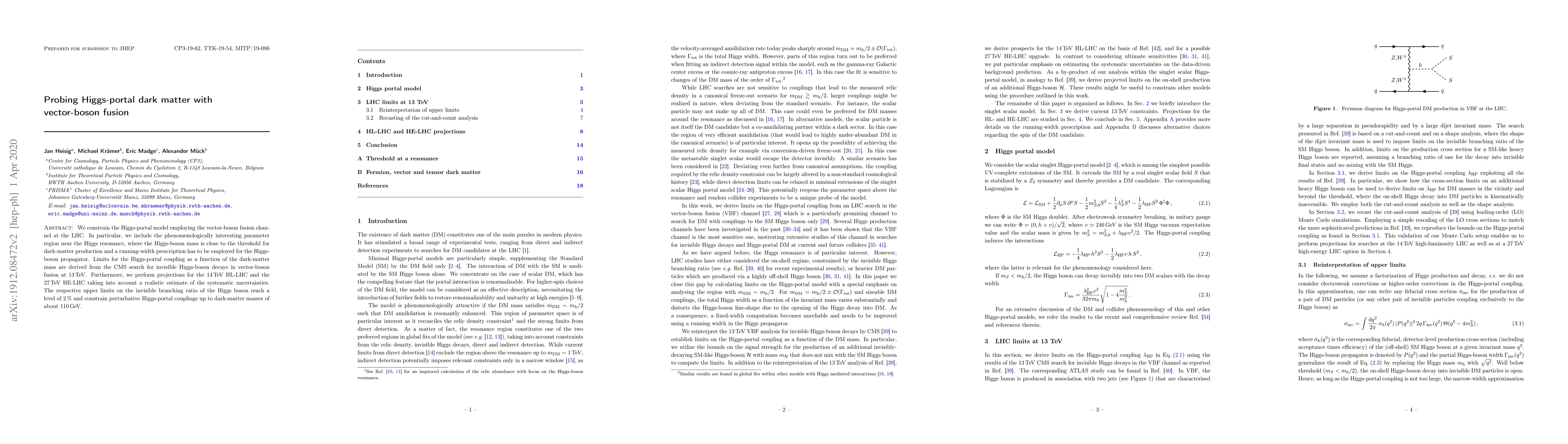 This paper derives limits on Higgs-portal dark matter using vector-boson fusion at the LHC, focusing on regions near the Higgs resonance. It projects future constraints from the HL-LHC and HE-LHC, achieving upper limits on the invisible branching ratio of the Higgs boson at around 2%.