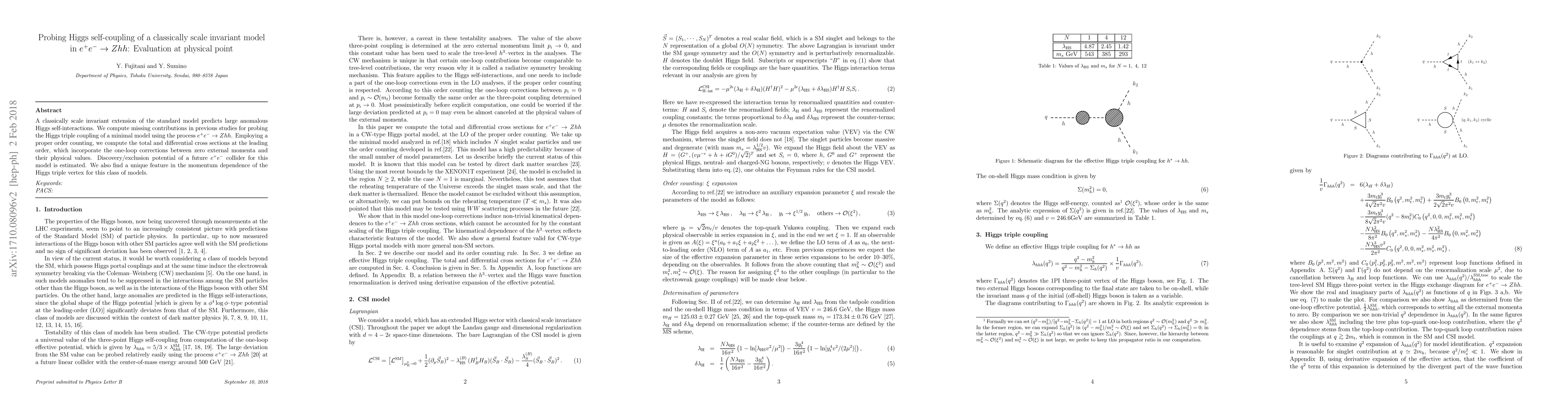 A classically scale invariant extension of the standard model predicts large anomalous Higgs self-interactions. We compute missing contributions in previous studies for probing the Higgs triple coupling of a minimal model using the process $e^+e^- \to Zhh$. Employing a proper order counting, we compute the total and differential cross sections at the leading order, which incorporate the one-loop corrections between zero external momenta and their physical values. Discovery/exclusion potential of a future $e^+e^-$ collider for this model is estimated. We also find a unique feature in the momentum dependence of the Higgs triple vertex for this class of models.