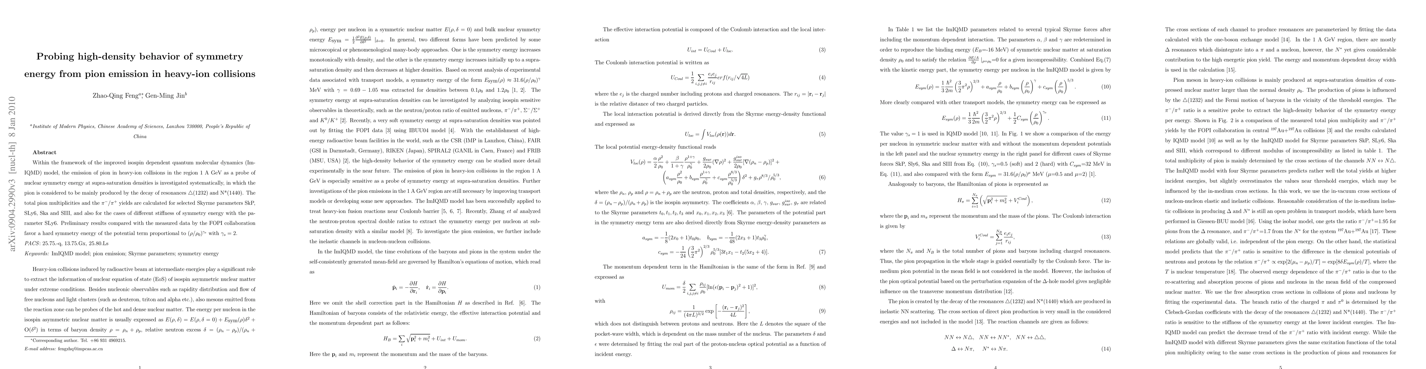 This study uses the improved isospin dependent quantum molecular dynamics (ImIQMD) model to investigate pion emission in heavy-ion collisions at 1 A GeV, aiming to probe nuclear symmetry energy at supra-saturation densities. Preliminary results suggest a hard symmetry energy with $\gamma_{s}=2$, supported by comparisons with FOPI collaboration data.