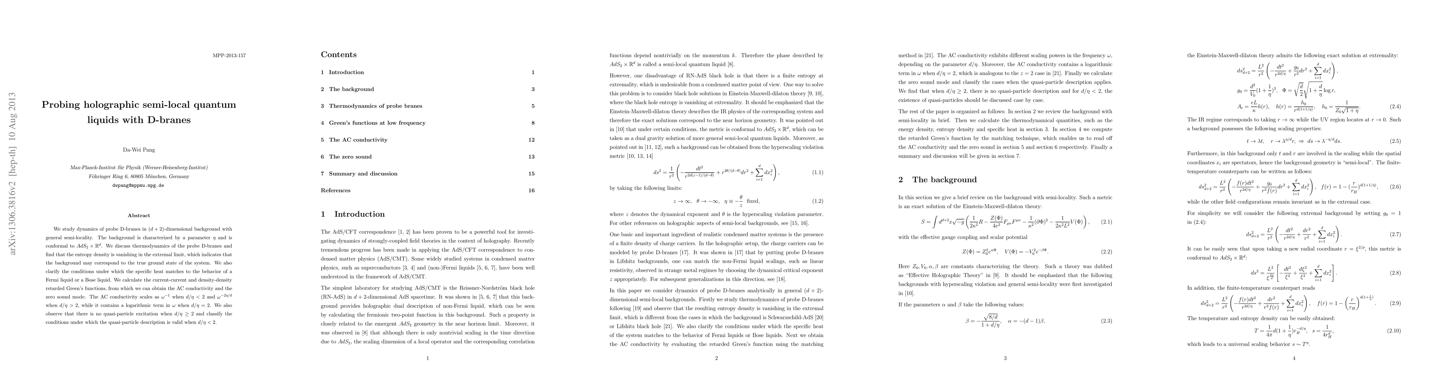 We study dynamics of probe D-branes in $(d+2)$-dimensional background with general semi-locality. The background is characterized by a parameter $\eta$ and is conformal to $AdS_{2}\times\mathbb{R}^{d}$. We discuss thermodynamics of the probe D-branes and find that the entropy density is vanishing in the extremal limit, which indicates that the background may correspond to the true ground state of the system. We also clarify the conditions under which the specific heat matches to the behavior of a Fermi liquid or a Bose liquid. We calculate the current-current and density-density retarded Green's functions, from which we can obtain the AC conductivity and the zero sound mode. The AC conductivity scales as $\omega^{-1}$ when $d/\eta<2$ and $\omega^{-2\eta/d}$ when $d/\eta>2$, while it contains a logarithmic term in $\omega$ when $d/\eta=2$. We also observe that there is no quasi-particle excitation when $d/\eta\geq2$ and classify the conditions under which the quasi-particle description is valid when $d/\eta<2$.