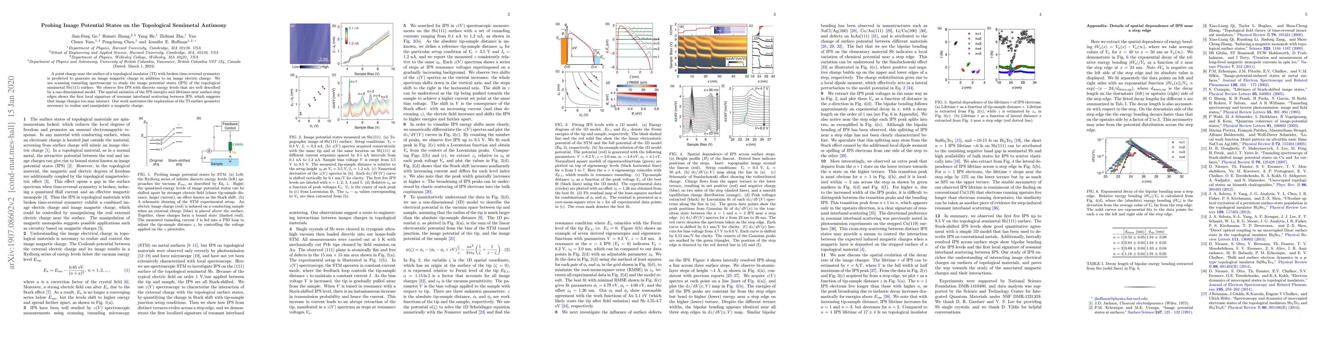 A point charge near the surface of a topological insulator (TI) with broken time-reversal symmetry is predicted to generate an image magnetic charge in addition to an image electric charge. We use scanning tunneling spectroscopy to study the image potential states (IPS) of the topological semimetal Sb(111) surface. We observe five IPS with discrete energy levels that are well described by a one-dimensional model. The spatial variation of the IPS energies and lifetimes near surface step edges shows the first local signature of resonant interband scattering between IPS, which suggests that image charges too may interact. Our work motivates the exploration of the TI surface geometry necessary to realize and manipulate a magnetic charge.